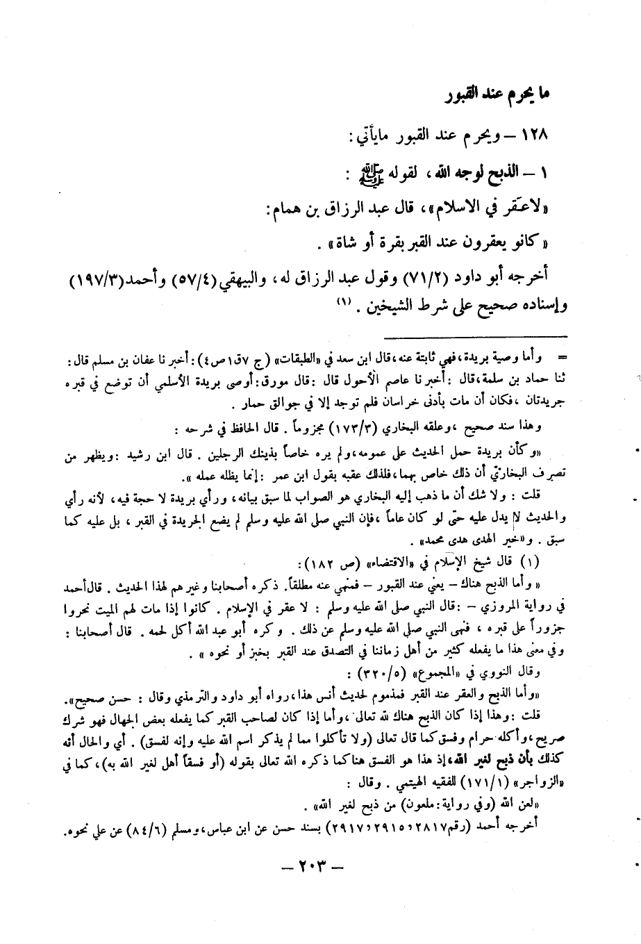 (وأما الذبح هناك - يعني عند القبور - فمنهي عنه مطلقا ذكره أصحابنا وغيرهم لهذا الحديث. قال أحمد في رواية المروزي -: قال النبي صلى الله عليه وسلم: لا عقر في الاسلام. كانوا إذا مات لهم الميت نحروا جزورا على قبره، فنهى النبي صلى الله عليه وسلم عن ذلك. وكره أبو عبد الله أكل لحمه. قال أصحابنا: وفي معنى هذا ما يفعله كثير من أهل زماننا في التصدق عند القبر بخبز أو نحوه)