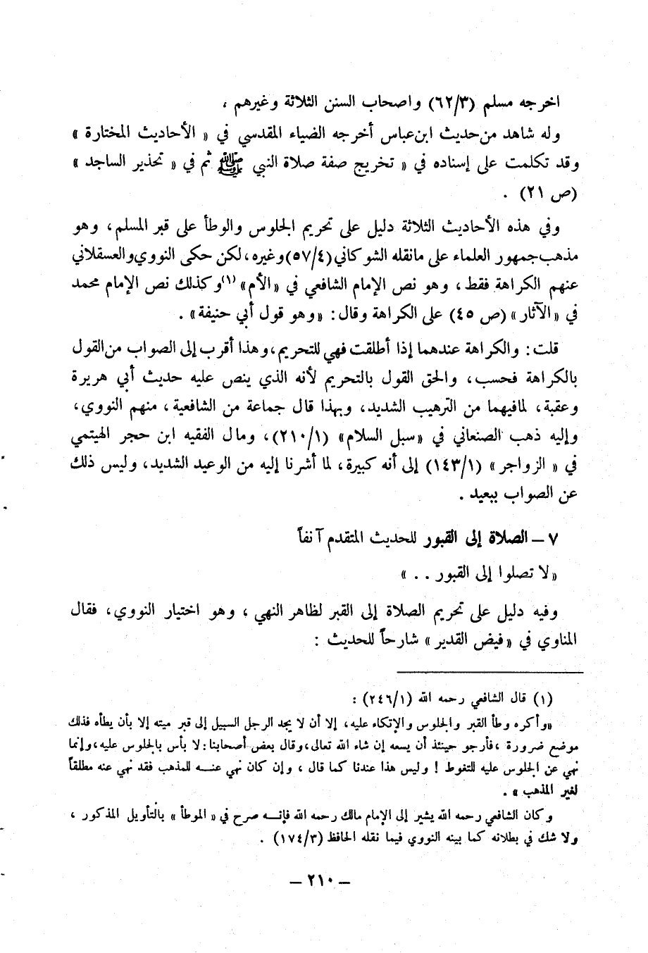 وفي هذه الاحاديث الثلاثة دليل على تحريم الجلوس والوطأ على قبر المسلم، وهو مذهب جمهور العلماء على ما نقله الشوكاني (4/ 57) وغيره، لكن حكى النووي والعسقلاني عنهم الكراهة فقط، وهو نص الامام الشافعي في (الأم) (1) وكذلك نص الامام محمد في (الآثار) (ص 45) على الكراهة وقال: (وهو قول أبي حنيفة).