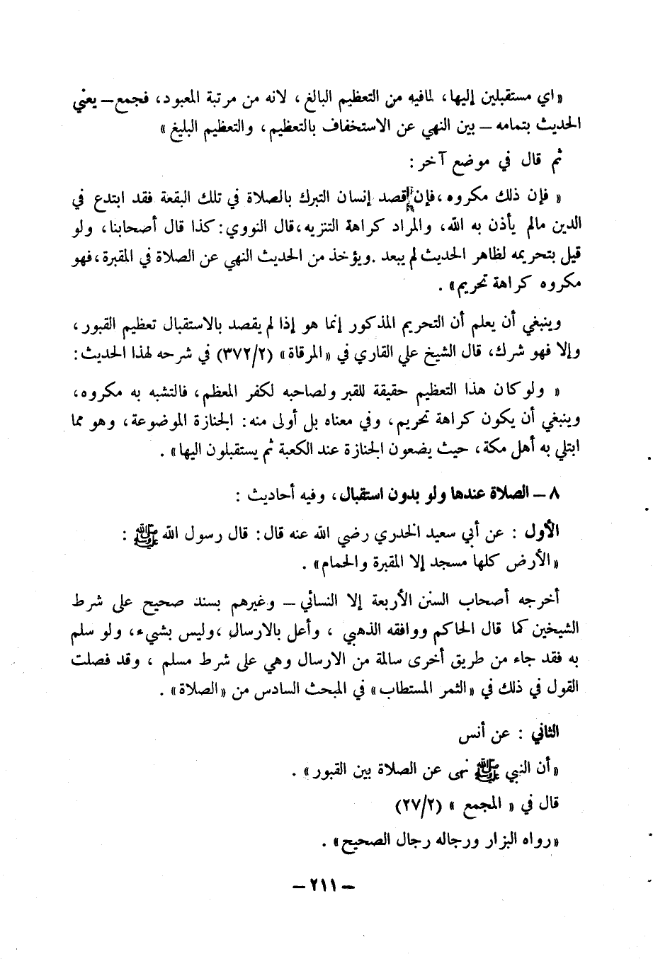(أي مستقبلين إليها، لما فيه من التعظيم البالغ، لانه من مرتبة المعبود، فجمع - يعنى الحدبث بتمامه - بين النهي عن الاستخفاف بالتعظيم، والتعظيم البليغ) ثم قال في موضع آخر: (فإن ذلك مكروه، فإن قصد إنسان التبرك بالصلاة في ثلك البقعة فقد ابتدع في الدين ما لم يأذن به الله، والمراد كراهة التنزيه، قال النووي: كذا قال أصحابنا، ولو قيل بتحريمه لظاهر الحديث لم يبعد.