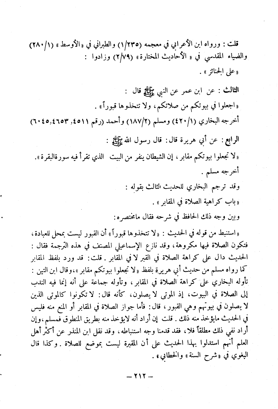 الثالث: عن ابن عمر عن النبي صلى الله عليه وسلم قال: (اجعلوا في بيوتكم من صلاتكم، ولا تتخذوها قبورا).