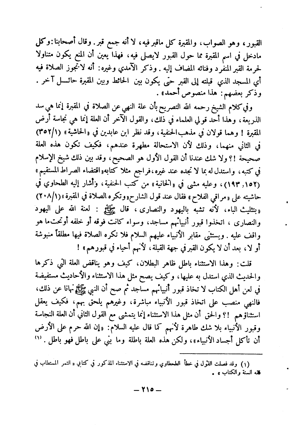 وفي كلام الشيخ رحمه الله التصريح بأن علة النهي عن الصلاة في المقبرة إنما هي سد الذريعة، وهذا أحد قولي العلماء في ذلك، والقول الاخر أن العلة إنما هي نجاسة أرض المقبرة! وهما قولان في مذهب الحنفية، وقد نظر ابن عابدين في (الحاشية) (1/ 352) في الثاني منهما، وذلك لان الاستحالة مطهرة عندهم، فكيف تكون هذه العلة صحيحة!؟ ولا شك عندنا أن القول الأول هو الصحيح، وقد بين ذلك شيخ الاسلام في كتبه، واستدل له بما لا تجده عند غيره، فراجع مثلا كتابه (اقتضاء الصراط المستقيم) (152، 193)، وعليه مشى في (الحانية) من كتب الحنيفة، وأشار إليه الطحاوي في حاشيته على (مراقي الفلاح) فقال عند قول الشارح (وتكره الصلاة في المقبرة) (1/ 208) (بتثليث الباء، لانه تشبه باليهود والنصارى، قال صلى الله عليه وسلم: لعنة الله على اليهود والنصارى، اتخذوا قبور أنبيائهم مساجد، وسواء كانت فوقه أو خلفه أو تحت ما هو واقف عليه. ويستثنى مقابر الأنبياء عليهم السلام فلا تكره الصلاة فيها مطلقا منبوشة أو لا، بعد أن لا يكون القبر في جهة القبلة، لانهم أحياء في قبورهم)!