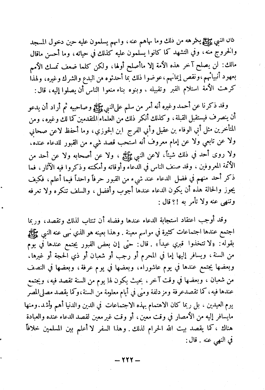 قال: حتي إن بعض القبور يجتمع عندها في يوم من السنة، ويسافر إليها إما في المحرم أو رجب أو شعبان أو ذي الحجة أو غيرها. وبعضها يجتمع عندها في يوم عاشوراء، وبعضها في يوم عرفة، وبعضها في النصف من شعبان. وبعضها في وقت آخر. بحيث يكون لها يوم من السنة تقصد فيه. ويجتمع عندها فيه. كما تقصد عرفة ومزدلفة ومنى في أيام معلومة من السنة، وكما يقصد مصلى المصر يوم العيدين، بل ربما كان الاهتمام بهذه الاجتماعات في الدين والدنيا أهم وأشد ومنها ما يسافر إليه من الامصار في وقت معين، أو وقت غير معين لقصد الدعاء عنده والعبادة هناك، كما يقصد بيت الله الحرام لذلك وهذا السفر لا أعلم بين المسلمين خلافا في النهي عنه. قال: