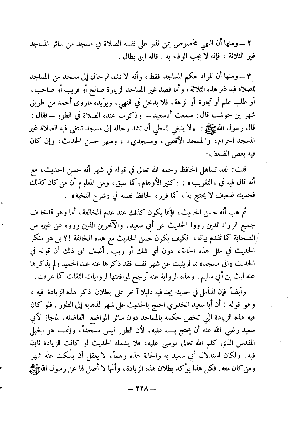 أضف إلى ذلك أن قوله في الحديث (إلى مسجد) مما لم يثبت عن شهر نفسه فقد ذكرها عنه عبد الحميد ولم يذكرها عنه ليث بن أبي سليم، وهذه الرواية عنه أرجح لموافقتها لروايات الثقات كما عرفت.
