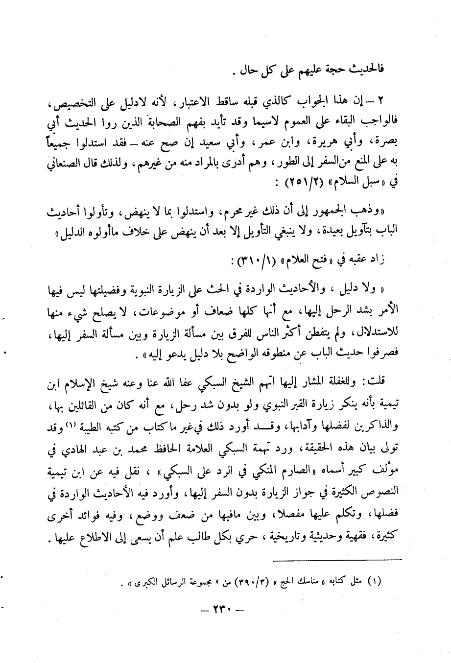 2 - إن هذا الجواب كالذي قبله ساقط الاعتبار، لانه لا دليل على التخصيص، فالواجب البقاء على العموم لا سيما وقد تأيد بفهم الصحابة إلذين روا الحديث أبي بصرة، وأبي هريرة، وابي عمر، وأبي سعيد إن صح عنه - فقد استدلوا جميعا به على المنع من السفر إلى الطور، وهم أدرى بالمراد منه من غيرهم، ولذلك قال الصنعاني في (سبل السلام) (2/ 251): (وذهب الجمهور إلى أن ذلك غير محرم، واستدلوا بما لا ينهض، وتأولوا أحاديث الباب بتأويل بعيدة، ولا ينبغي التأويل إلا بعد أن ينهض على خلاف ما أولوه الدليل) زاد عقبه (فتح العلام) (1/ 310): (ولا دليل، والاحاديث الواردة في الحث على الزيارة النبوية وفضيلتها ليس فيها الامر بشد الرحل إليها، مع أنها كلها ضعاف أو موضوعات، لا يصلح شئ منها للاستدلال، ولم يتفطن أكثر الناس للفرق بين مسألة الزيارة وبين مسألة السفر إليها، فصرفوا حديث الباب عن منطوقه الواضح بلا دليل يدعو إليه).