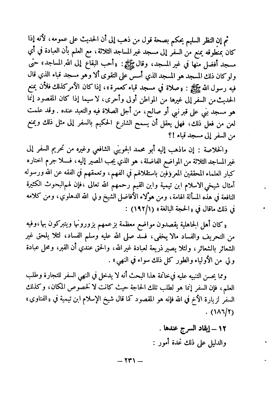 وقد علمت لعن من فعل ذلك، فهل يعقل أن يسمح الشارع الحكيم بالسفر إلى مثل ذلك ويمنع من السفر إلى مسجد قباء!؟ والخلاصة: إن ما ذهب إليه أبو محمد الجويني الشافعي وغيره من تحريم السفر إلى غير المساجد الثلاثة من المواضع الفاضلة، هو الذي يجب المصير إليه، فلا جرم اختاره كبار العلماء المحققين المعروفين باستقلالهم في الفهم، وتعمقهم في الفقه عن الله ورسوله أمثال شيخي الاسلام ابن تيمية وابن القيم رحمهم الله تعالى، فإن لهم البحوث والكثيرة النافعة في هذه المسألة الهامة، ومن هؤلاء الافاضل الشيخ ولي الله الدهلوي، ومن كلامه في ذلك ما قال في (الحجة البالغة) (1/ 192): (كان أهل الجاهلية يقصدون مواضع معظمة بزعمهم يزورونها ويتبركون بها، وفيه من التحريف والفساد ما لا يخفى، فسد صلى الله عليه وسلم الفساد، لئلا يلحق غير الشعائر بالشعائر، ولئلا يصير ذريعة لعبادة غير الله، والحق عندي أن القبر، ومحل عبادة ولي من الأولياء والطور كل ذلك سواء في النهي).