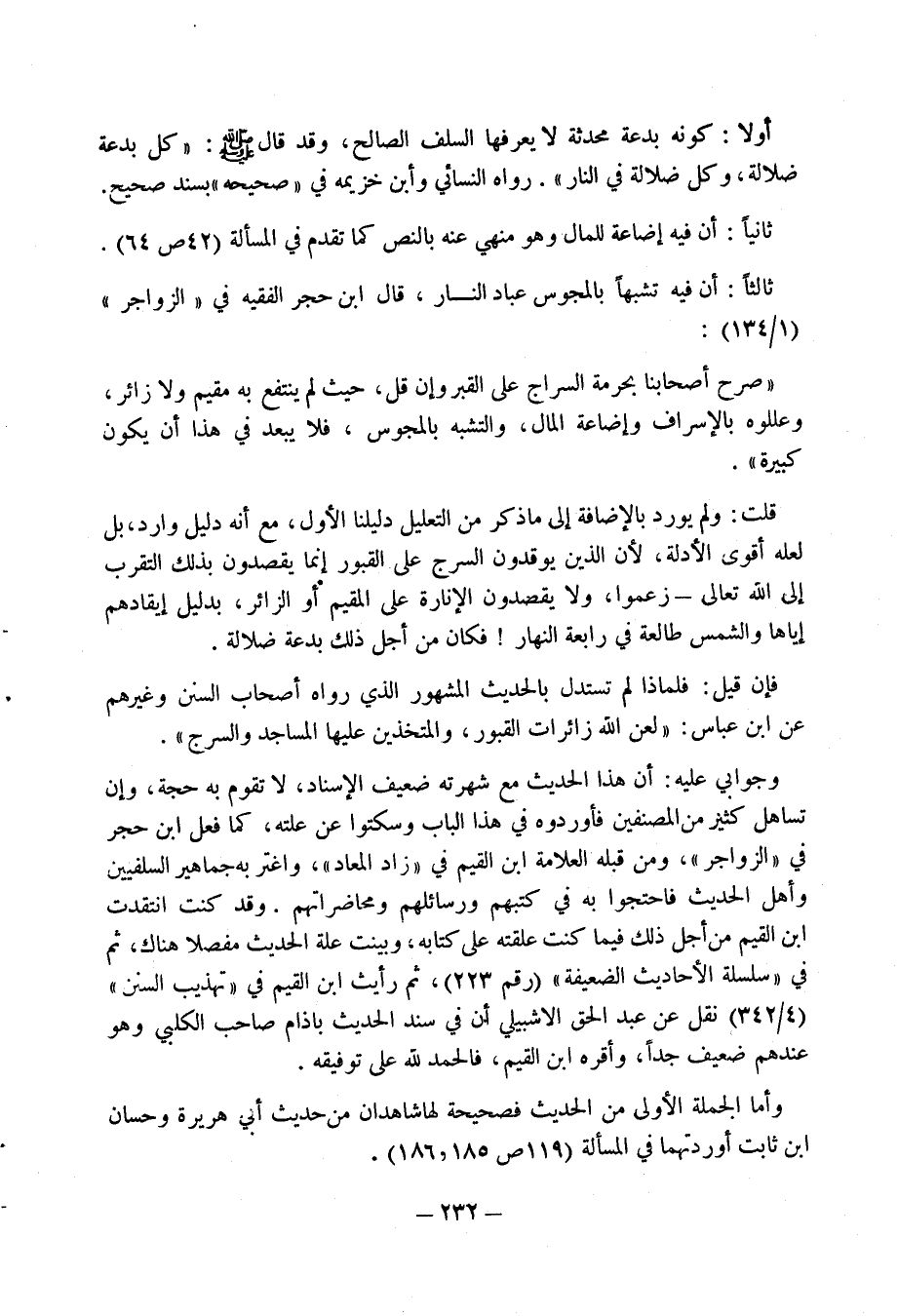 قلت: ولم يورد بالاضافة إلى ما ذكر من التعليل دليلنا الأول، مع أنه دليل وارد، بل لعله أقوى الادلة، لان الذين يوقدون السرج على القبور إنما يقصدون بذلك التقرب إلى الله تعالى - زعموا، ولا يقصدون الانارة على المقيم أو الزائر، بدليل إيقادهم إياها والشمس طالعة في رابغة النهار! فكان من أجل ذلك بدعة ضلالة.