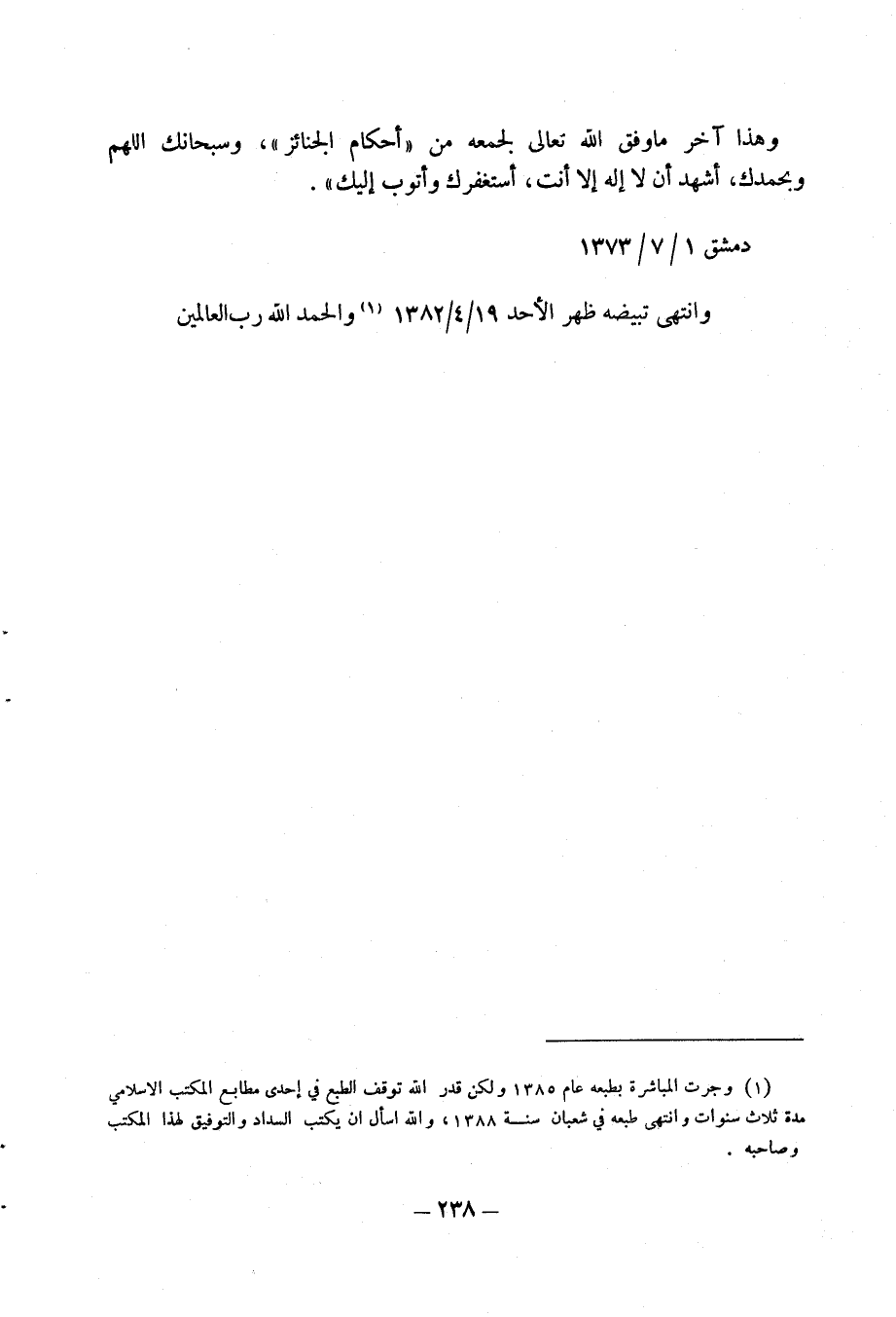 (1) وجرت المباشرة بطبعه عام 1385 ولكن قدر الله توقف الطبع في إحدى مطابع المكتب الاسلامي مدة ثلاث سنوات وانتهى طبعه في شعبان سنة 1388، والله اسأل ان يكتب السداد والتوفيق لهذا المكتب وصاحبه.