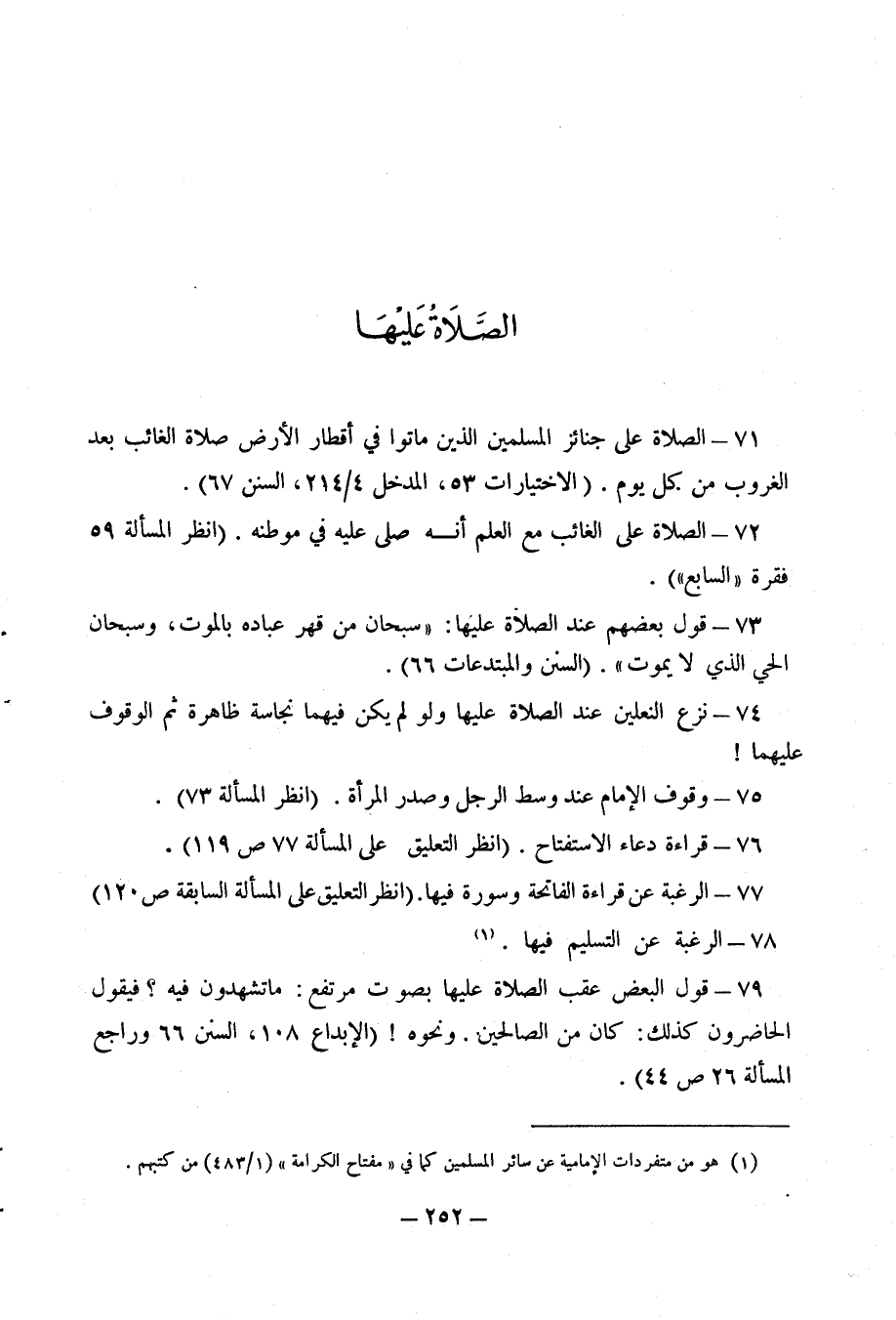 71 - الصلاة على جنائز المسلمين الذين ماتوا في أقطار الارض صلاة الغائب بعد الغروب من كل يوم. (الاختيارات 53، المدخل 4/ 214، السنن 67).