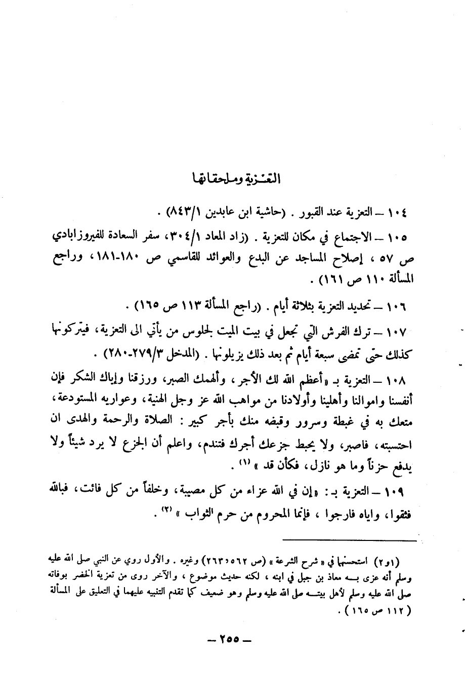 105 - الاجتماع في مكان للتعزية. (زاد المعاد 1/ 304، سفر السعادة للفيروزابادي ص 57، إصلاح المساجد عن البدع والعوائد للقاسمي ص 180 - 181، وراجع المسألة 110 ص 161).