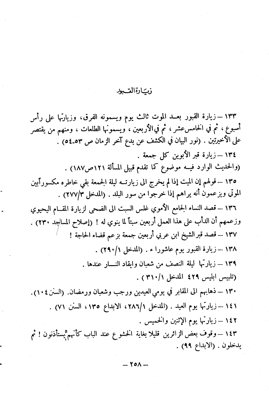 135 - قولهم إن الميت إذا لم يخرج إلى زيارته ليلة الجمعة بقي خاطره مكسورا بين الموتي ويزعمون أنه يراهم إذا خرجوا من سور البلد. (المدخل 3/ 277).