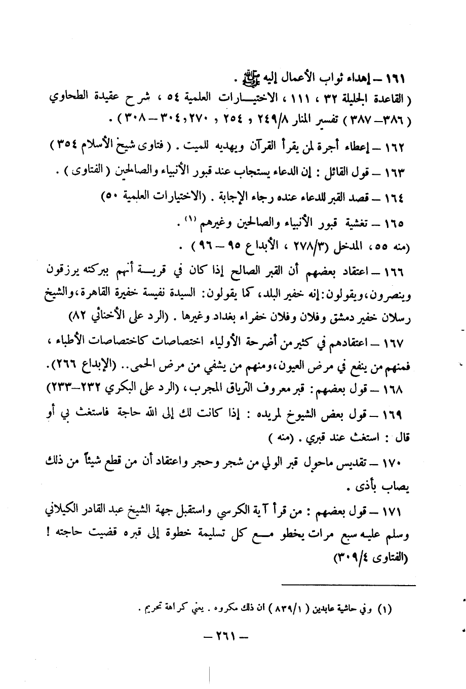 167 - اعتقادهم في كثير من أضرحة الأولياء اختصاصات كاختصاصات الاطباء، فمنهم من ينفع في مرض العيون، ومنهم من يشفي من مرض الحمى .. (الابداع 266).