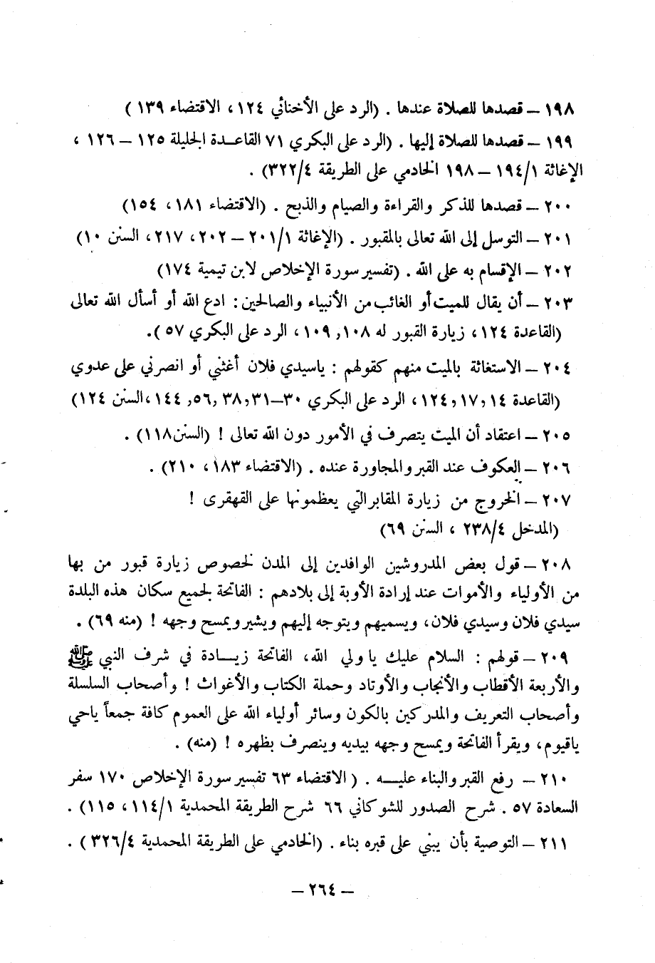 210 - رفع القبر والبناء عليه. (الاقتضاء 63 تفسير سورة الاخلاص 170 سفر السعادة 57. شرح الصدور للشوكاني 66 شرح الطريقة المحمدية 1/ 114، 115).