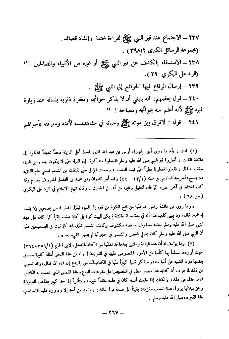 238 - الاستسقاء بالكشف عن قبر النبي صلى الله عليه وسلم أو غيره من الانبياء والصالحين. (1) (الرد على البكري 29).