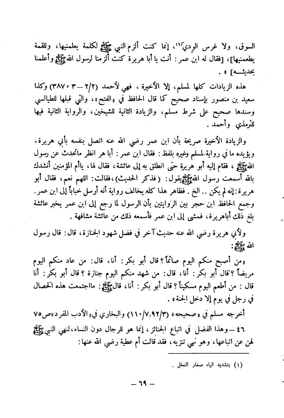 أخرجه مسلم في " صحيحه " (3/ 92، 7/ 110) والبخاري في " الادب المفرد " ص 75 46 - وهذا الفضل في اتباع الجنائز، إنما هو للرجال دون النساء لنهي النبي صلى الله عليه وسلم لهن عن اتباعها، وهو نهي تنزيه، فقد قالت أم عطية رضي الله عنها: