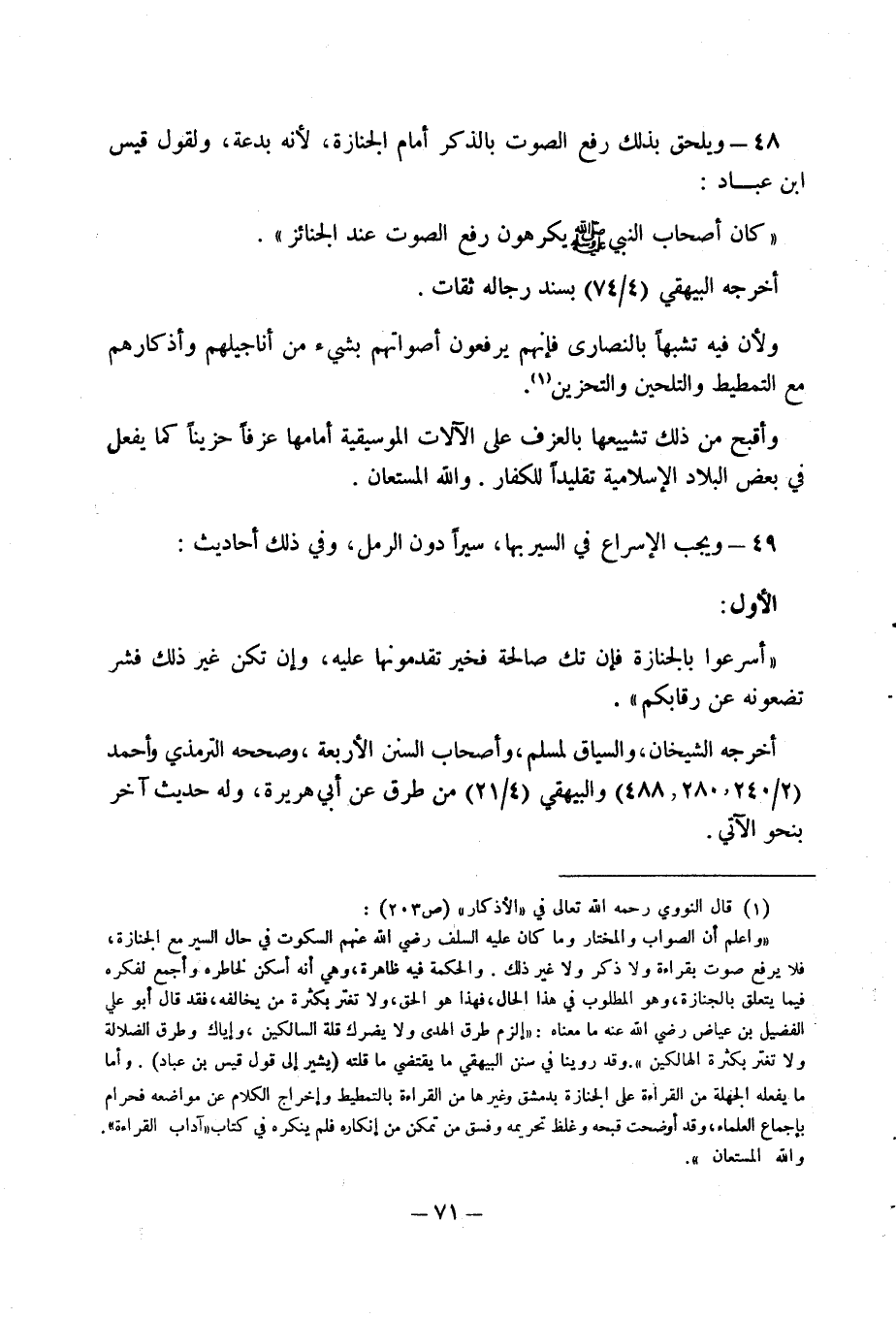 48 - ويلحق بذلك رفع الصوت بالذكر أمام الجنازة، لانه بدعة، ولقول قيس ابن عباد: " كان أصحاب النبي صلى الله عليه وسلم يكرهون رفع الصوت عند الجنائز ".