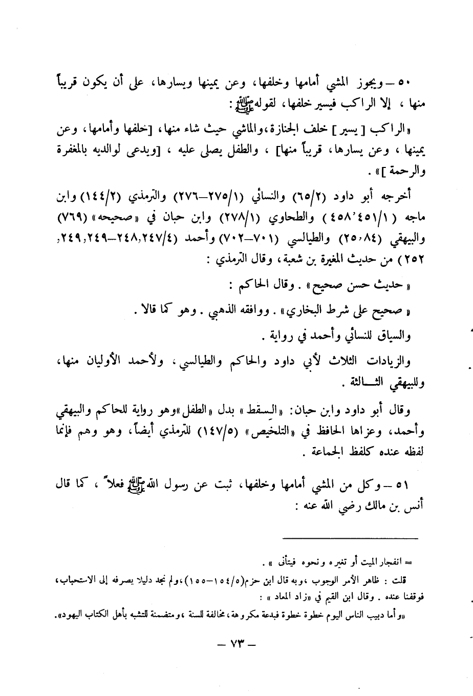 51 - وكل من المشي أمامها وخلفها، ثبت عن رسول الله صلى الله عليه وسلم فعلا، كما قال أنس بن مالك رضي الله عنه:
