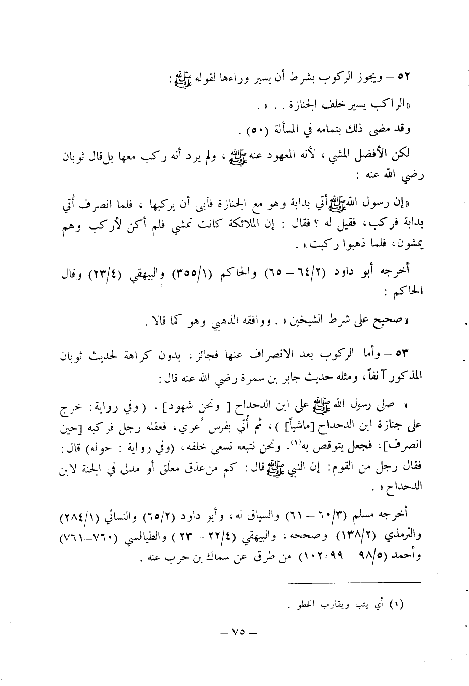 53 - وأما الركوب بعد الانصراف عنها فجائز، بدون كراهة لحديث ثوبان المذكور آنفا، ومثله حديث جابر بن سمرة رضي الله عنه قال: " صلى رسول الله صلى الله عليه وسلم على ابن الدحداح (ونحن شهود)، (وفي رواية: خرج على جنازة ابن الدحداح (ماشيا))، ثم أتي بفرس عري، فعقله رجل فر كبه (حين انصراف)، فجعل يتوقص به (1)، ونحن نتبعه نسعى خلفه، (وفي رواية: حوله) قال: فقال رجل من القوم: إن النبي صلى الله عليه وسلم قال: كم من عذق معلق أو مدلى في الجنة لابن الدحداح ".