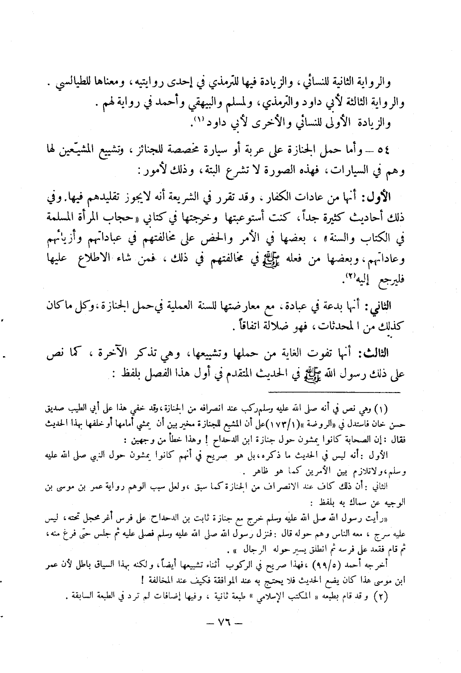 54 - وأما حمل الجنازة على عربة أو سيارة مخصصة للجنائز، وتشييع المشيعين لها وهم في السيارات، فهذه الصورة لا تشرع البتة، وذلك لأمور: