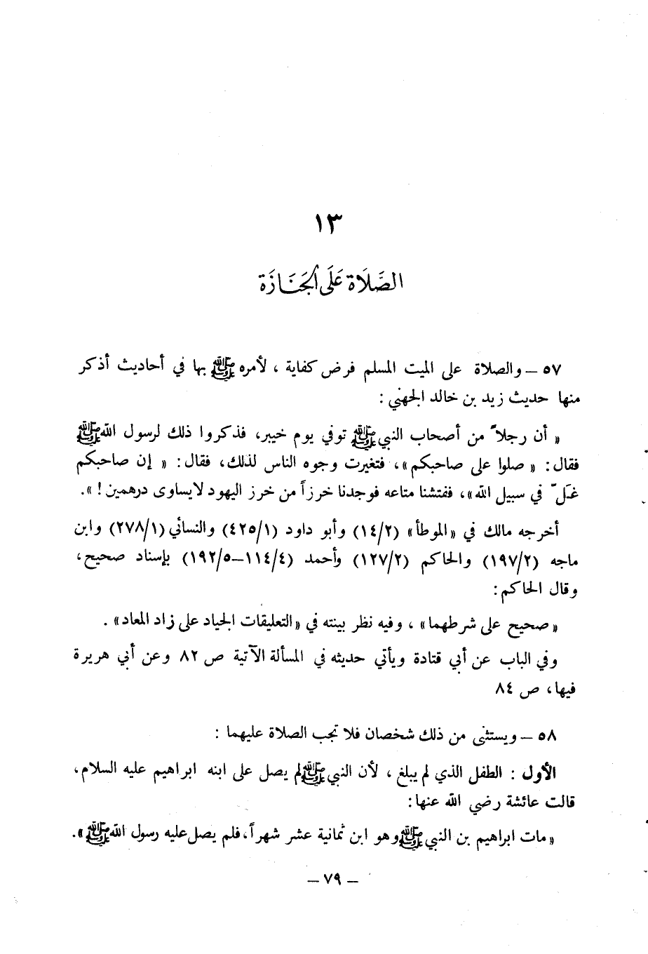 57 - والصلاة على الميت المسلم فرض كفاية، لأمره صلى الله عليه وسلم بها في أحاديث أذكر منها حديث زيد بن خالد الجهني: