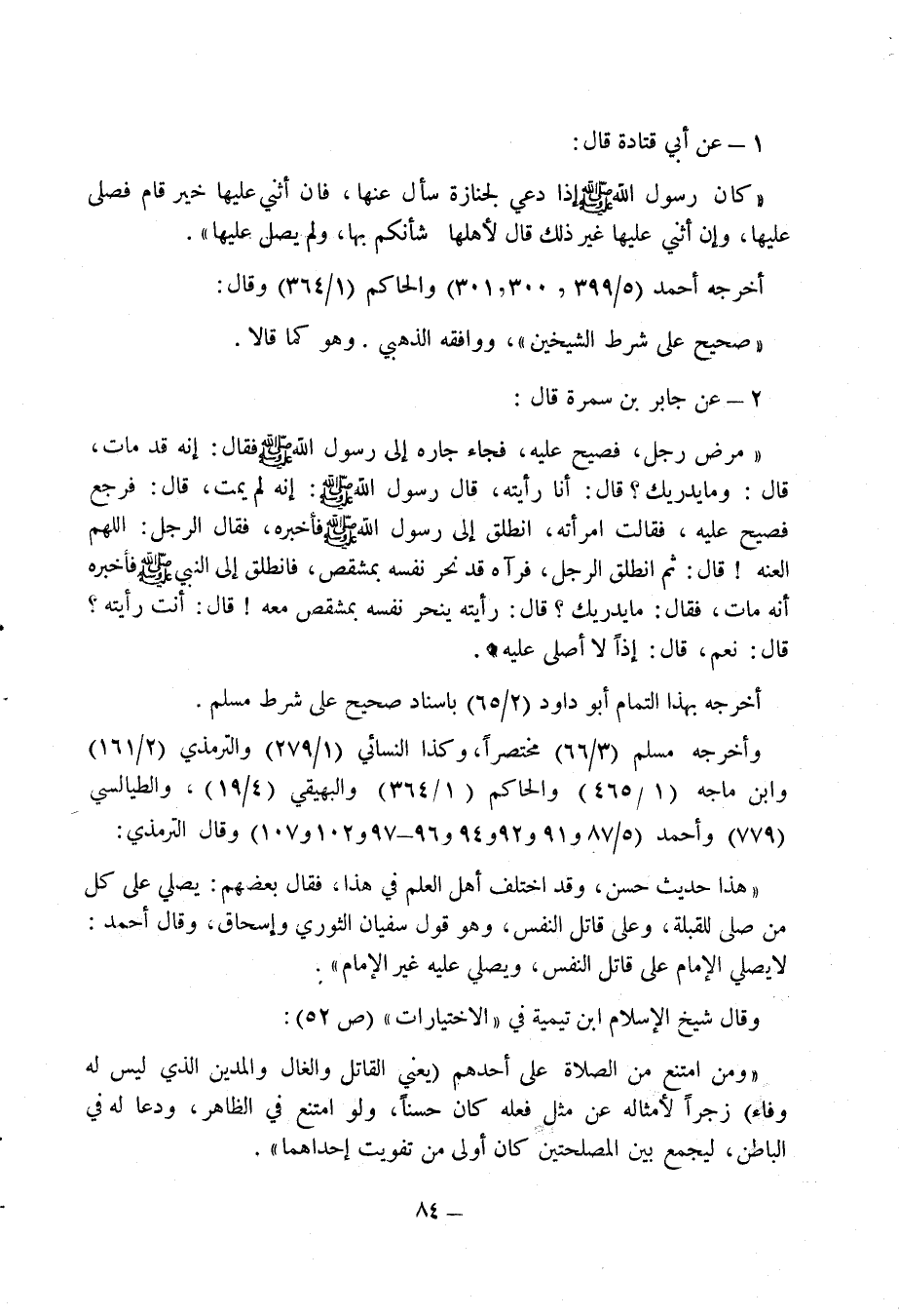 1 - عن أبن قتادة قال: " كان رسول الله صلى الله عليه وسلم إذا دعي لجنازة سأل عنها، فان أثني عليها خير قام فصلى عليها، وإن أثني عليها غير ذلك قال لأهلها شأنكم بها، ولم يصل عليها " أخرجه أحمد (5/ 399، 300، 301) والحاكم (1/ 364) وقال: " صحيح على شرط الشيخين "، وواففه الذهبي. وهو كما قالا.