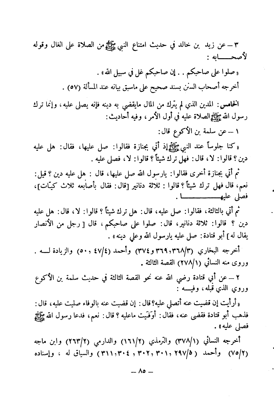 1 - عن سلمة بن الأكوع قال: " كنا جلوسا عند النبي صلى الله عليه وسلم إذ أتي بجنازة فقالوا: صل عليها، فقال: هل عليه دين؟ قالوا: لا، قال: فهل ترك شيئا؟ قالوا: لا، فصلى عليه. ثم أتي بجنازة أخرى فقالوا: يارسول الله صل عليها، قال: هل عليه دين؟ قيل: نعم، قال فهل ترك شيئا؟ قالوا: ثلاثة دنانير [قال: فقال بأصابعه ثلاث كيات]، فصلى عليها.
