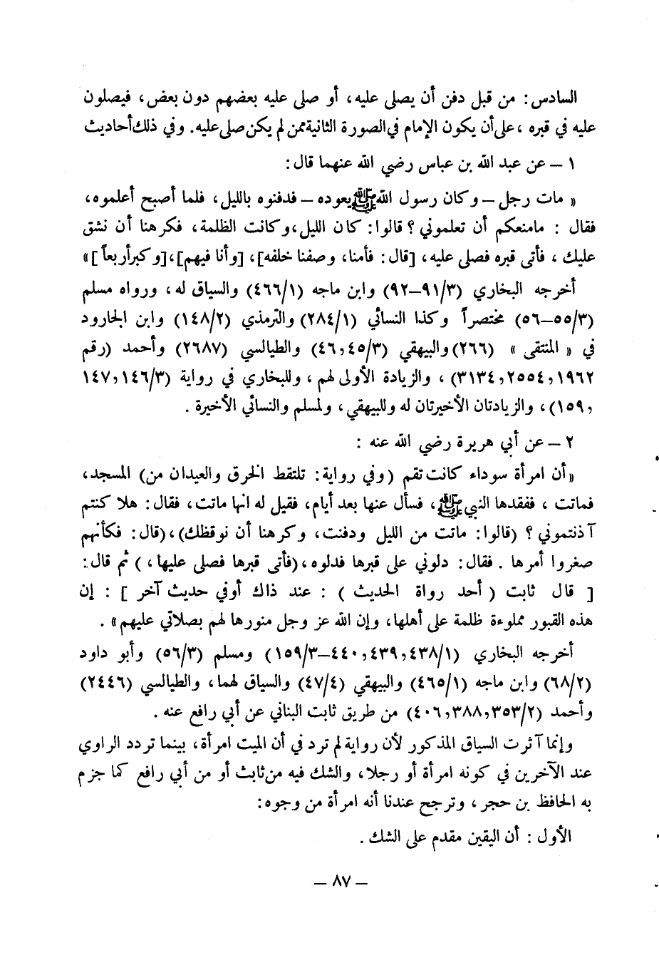 وإنما آثرت السياق المذكور لأن رواية لم ترد في أن الميت امرأة، بينما تردد الراوي عند الآخرين في كونه امرأة أو رجلا، والشك فيه من ثابث أو من أبي رافع كما جزم به الحافظ بن حجر، وترجح عندنا أنه امرأة من وجوه: