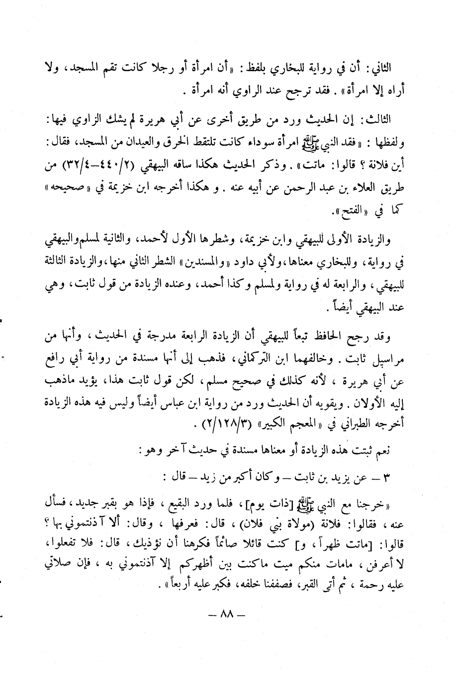 الثالث: إن الحديث ورد من طريق أخر عن أبي هريرة لم يشك الا روي فيها: ولفظها: " فقد النبي امرأة سوداء كانت تلتقط الخرق والعيدان من المسجد، فقال: أين فلانة؟ قالوا: ماتت ".