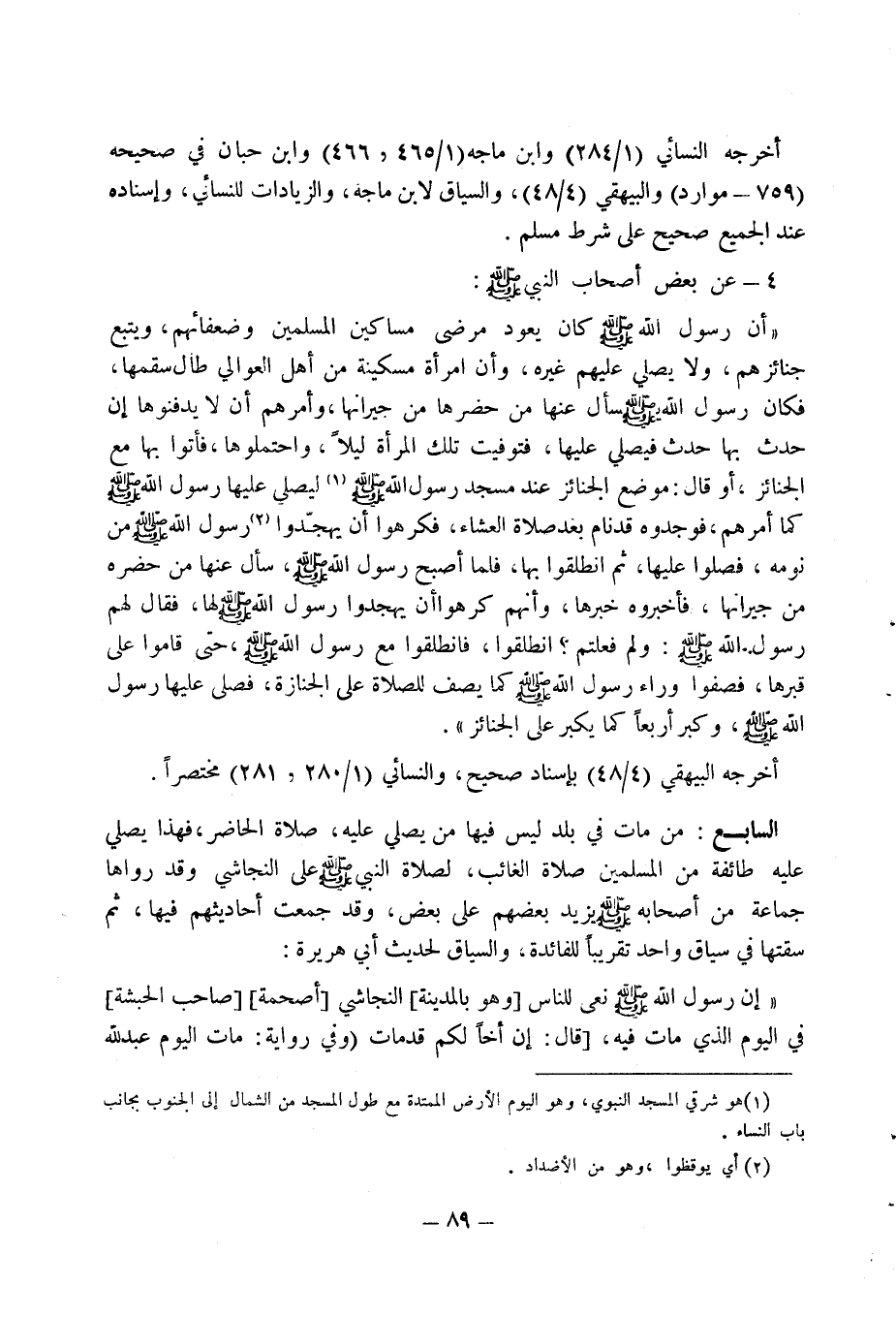 4 - عن بعض أصحاب النبي صلى الله عليه وسلم: أن رسول الله صلى الله عليه وسلم، كان يعود مرضى مساكين المسلمين وضعفائهم: ويتبع جنائزهم ولا يصلي عليهم غيره، وأن امرأة مسكينة من أهل العوالي طال سقمها، فكان رسول الله صلى الله عليه وسلم سأل عنها من حضرها من جيرانها " وأمرهم أن لا يدفنوها إن حدث بها حدث فيصلي عليها، فتوفيت تلك المرأة ليلا واحتملوها فأتوا بها مع الجنائز أو قال: موضع الجنائز عند مسجد رسول الله صلى الله عليه وسلم (1) ليصلي عليها رسول الله صلى الله عليه وسلم كما أمرهم فوجدوه قد نام بعد صلاة العشاء " فكرهوا أن يهجدوا (2) رسول الله صلى الله عليه وسلم من نومه فصلوا عليها. ثم انطلقوا بها، فلما أصبح رسول الله صلى الله عليه وسلم سأل عنها من حضره من جيرانها، فأخبروه خبرها، وانهم كررهوا ان يهجدوا رسول الله صلى الله عليه وسلم لها فقال لهم رسول الله صلى الله عليه وسلم: ولم فعلتم؟ انطلقوا، فانطلقوا مع رسول الله صلى الله عليه وسلم حتى قاموا على قبرها فصفوا وراء رسول الله صلى الله عيه وسلم كما يصف للصلاة على الجنازة فصلى عليها رسول الله صلى الله عليه وسلم وكبر أربعا كما يكبر على الجنائز " أخرجه البيهقي (4/ 48) بإسناد صحيح، والنسائي (1/ 280، 281) مختصرا السابع: من مات في بلد ليس فيها من يصلي عليه، صلاة الحاضر، فهذا يصلي عليه طائفة من المسلمين صلاة الغائب، لصلاة النبي صلى الله عليه وسلم على النجاشي وقد رواها جماعة من أصحابه يزيد بعضهم على بعض، وقد جمعت أحاديثهم فيها، ثم سقتها في سياق واحد تقريبا للفائدة. والسياق لحديث أبي هريرة: " إن رسول الله صلى الله عليه وسلم صلى الله عليه وسلم نعى للناس [وهو بالمدينة] النجاشي [أصحمه] [صاحب الحبشة] في اليوم الذي مات فيه: [قال: إن أخا قد مات (وفي رواية: مات اليوم عبد لله