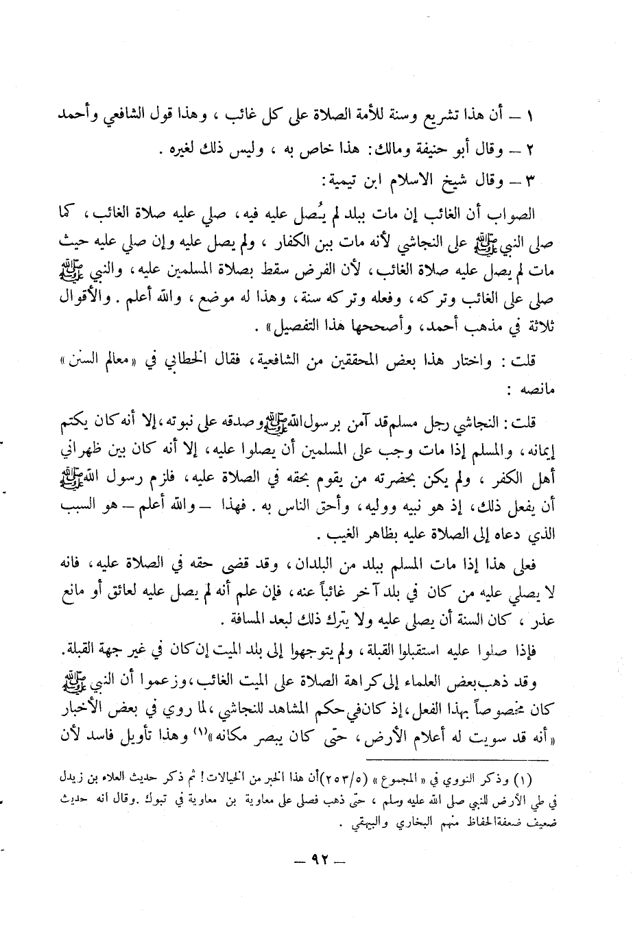 والأقوال ثلاثة في مذهب أحمد، وأصححها هذا التفصيل قلت: واختار هذا بنص المحققين من الشافعية فقال الخطابي في " معالم السنن " ما نصه: قلت: النشجاشي رجل مسلم قد آمن برسول الله صلى الله عليه وسلم وصدقه على نبوته.
