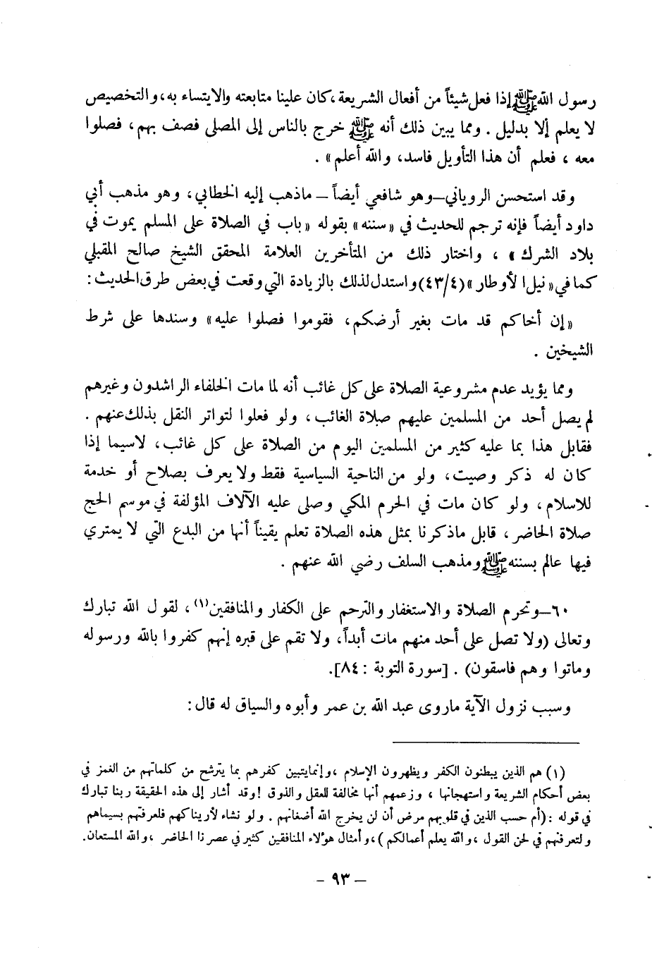فقابل هذا بما عليه كثير من المسلمين اليوم من الصلاة على كل غائب لاسيما إذا كان له ذكر وصيت، ولو من الناحية السياسية فقط ولا يعرف بصلاح أو خدمة للاسلام " ولو كان مات في الحرم المكى وصلى عليه الآلاف المؤلفة في موسم الحج صلاة الحاضر، قابل ما ذكرنا بمثل هذه الصلاة تعلم يقينا أنها من البدع التي لا يمتري فيها عالم بسننه صلى الله عليه وسلم ومذهب السلف رضي في الله عنهم.