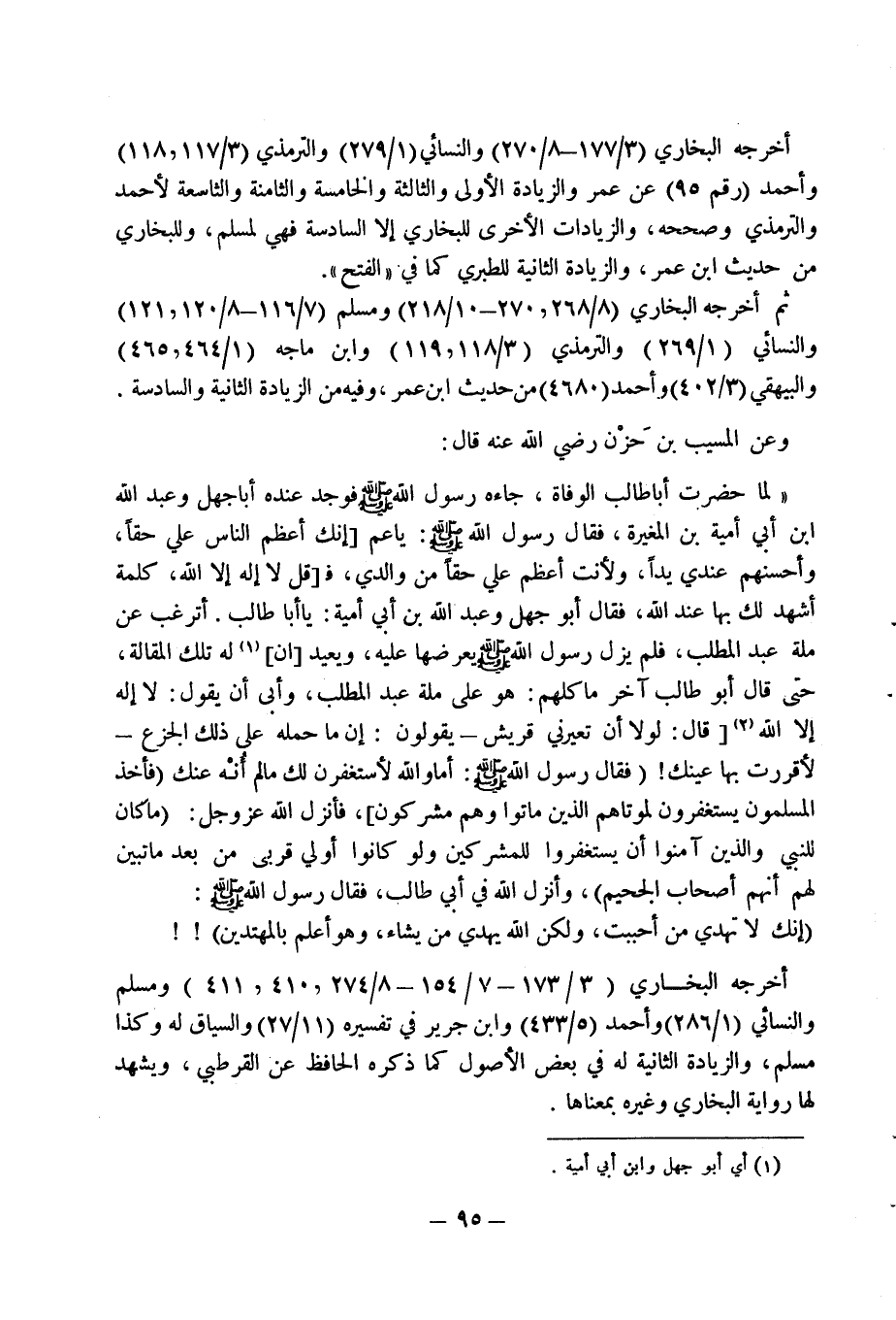 وعن المسيب بن حزن رضي الله عنه قال: " لما حضرت أبا طالب الوفاة " جاءه رسول الله فوجد عنده أبا جهل، وعبد الله ابن أبي أمية، والمغيرة فقال رسول الله صلى الله عليه وسلم: يا عم إنك أعظم الناس علي حقا، وأحسنهم عندي يدا.