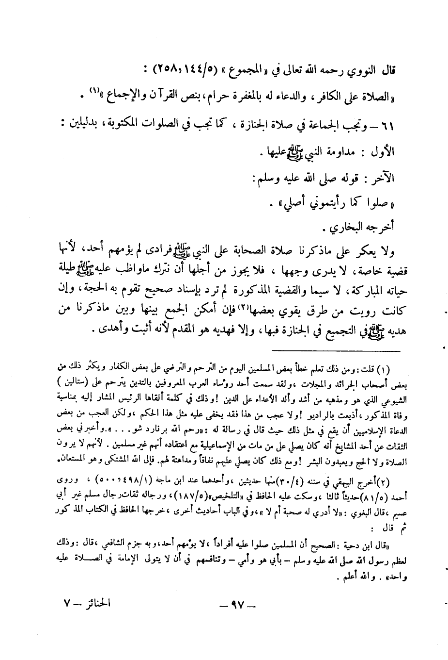 61 - وتجب الجماعة في صلاة الجنارة كما تجب في الصلوات المكتوبة، بدليلين:
