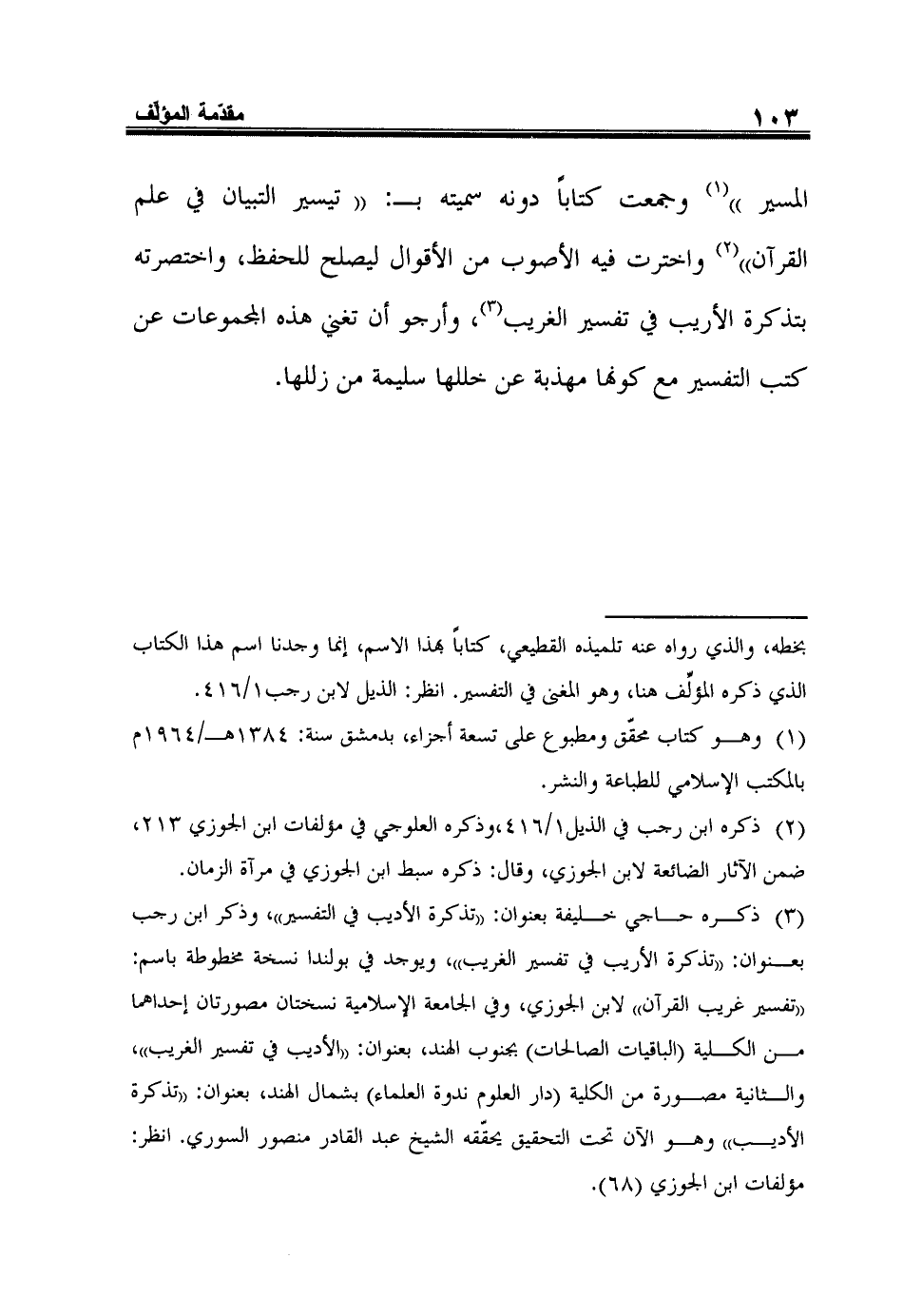 المسير) 1 وجمعت كتاباً دونه سميته بـ: (تيسير التبيان في علم القرآن) 2 واخترت فيه الأصوب من الأقوال ليصلح للحفظ، واختصرته بتذكرة الأريب في تفسير الغريب3، وأرجو أن تغني هذه المجموعات عن كتب التفسير مع كونها مهذبة عن خللها سليمة من زللها.