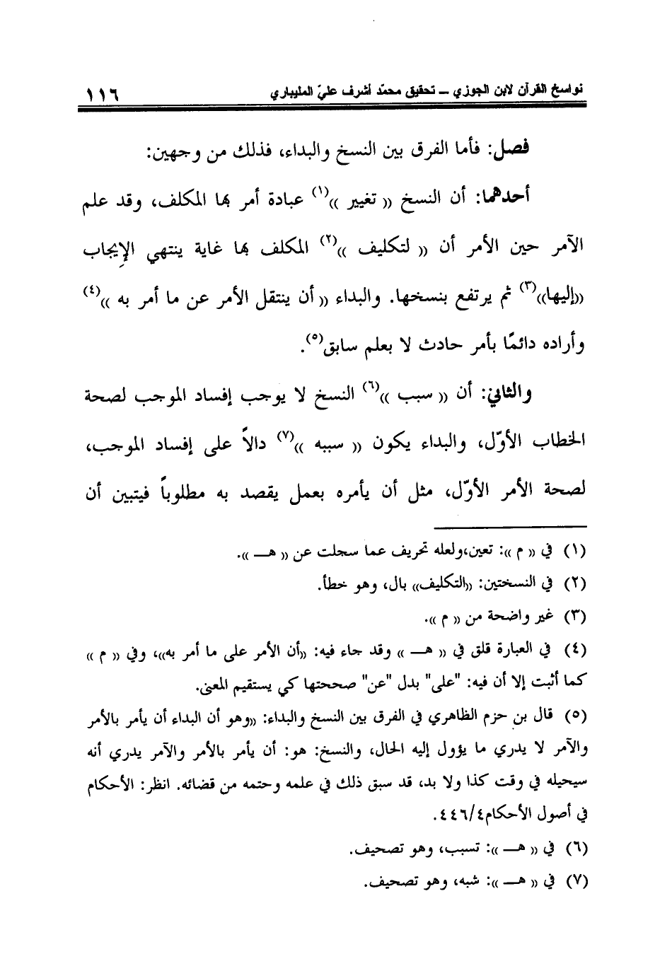 أحدهما: أَنَّ النَّسْخَ (تَغْيِيرُ) 1 عِبَادَةٍ أَمَرَ بِهَا الْمُكَلِّفُ، وَقَدْ عَلِمَ الْآمِرُ حِينَ الأَمْرِ أَنَّ (لِتَكْلِيفِ) 2 الْمُكَلَّفِ بِهَا غَايَةً يَنْتَهِي الإِيجاب (إِلَيْهَا) 3 ثُمَّ يَرْتَفِعُ بِنَسْخِهَا. وَالْبَدَاءُ (أَنْ ينتقل الأمر عن ما أمر بِهِ) 4 وَأَرَادَهُ دَائِمًا بِأَمْرِ حَادِثٍ لا بِعِلْمٍ سَابِقٍ5.