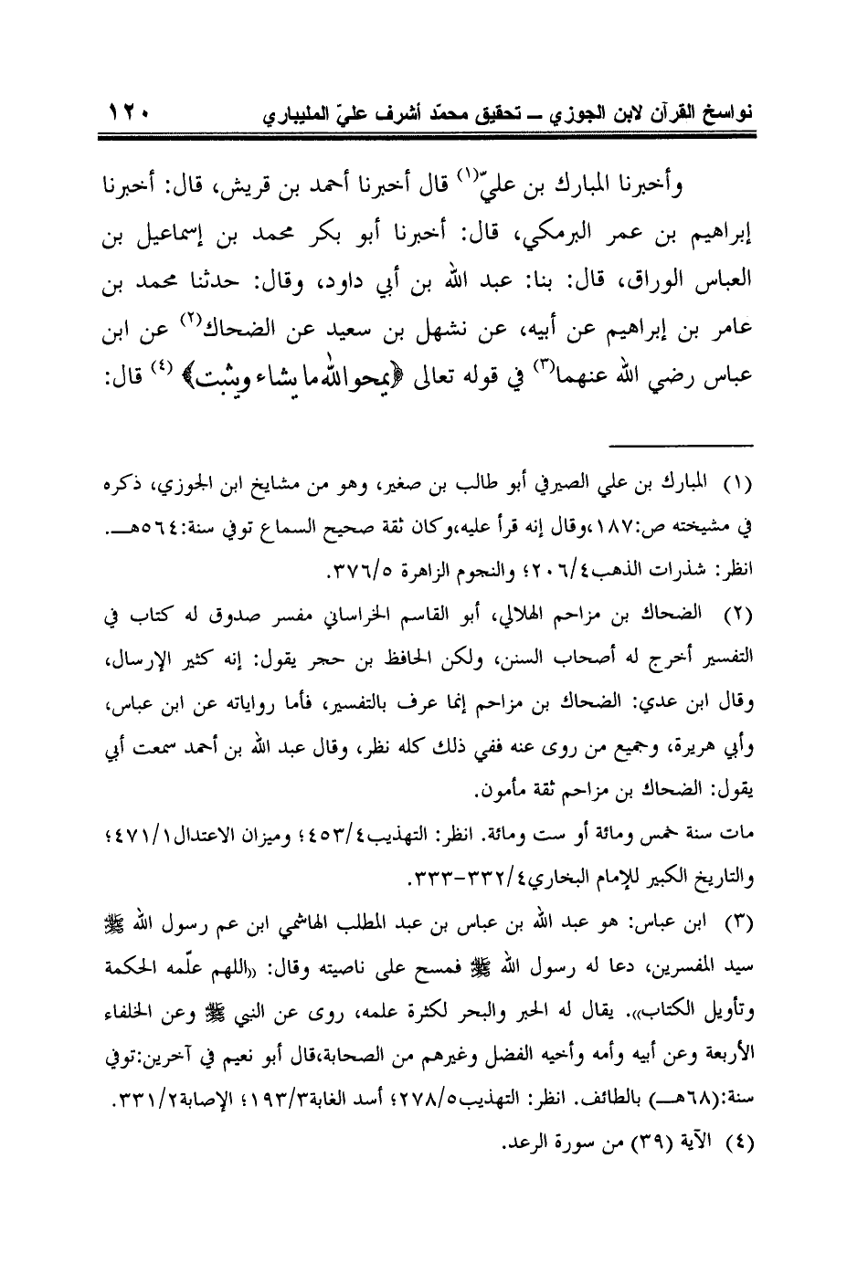 وَأَخْبَرَنَا الْمُبَارَكُ بْنُ عَلِيٍّ1 قَالَ أَخْبَرَنَا أَحْمَدُ بْنُ قُرَيْشٍ، قَالَ: أَخْبَرَنَا إِبْرَاهِيمُ بْنُ عُمَرَ الْبَرْمَكِيُّ، قَالَ: أَخْبَرَنَا أَبُو بَكْرٍ مُحَمَّدُ بْنُ إِسْمَاعِيلَ بْنِ الْعَبَّاسِ الْوَرَّاقُ، قال: بنا: عَبْدُ اللَّهِ بْنُ أَبِي دَاوُدَ، وَقَالَ: حَدَّثَنَا مُحَمَّدُ بْنُ عَامِرِ بْنِ إِبْرَاهِيمَ عَنْ أَبِيهِ، عَنْ نَشْهَلِ بْنِ سَعِيدٍ عَنِ الضَّحَّاكِ2 عَنِ ابْنِ عَبَّاسٍ رَضِيَ اللَّهُ عنهما3 في قوله تعالى: {يَمْحُوا اللَّهُ مَا يَشَاءُ وَيُثْبِتُ} 4 قال: