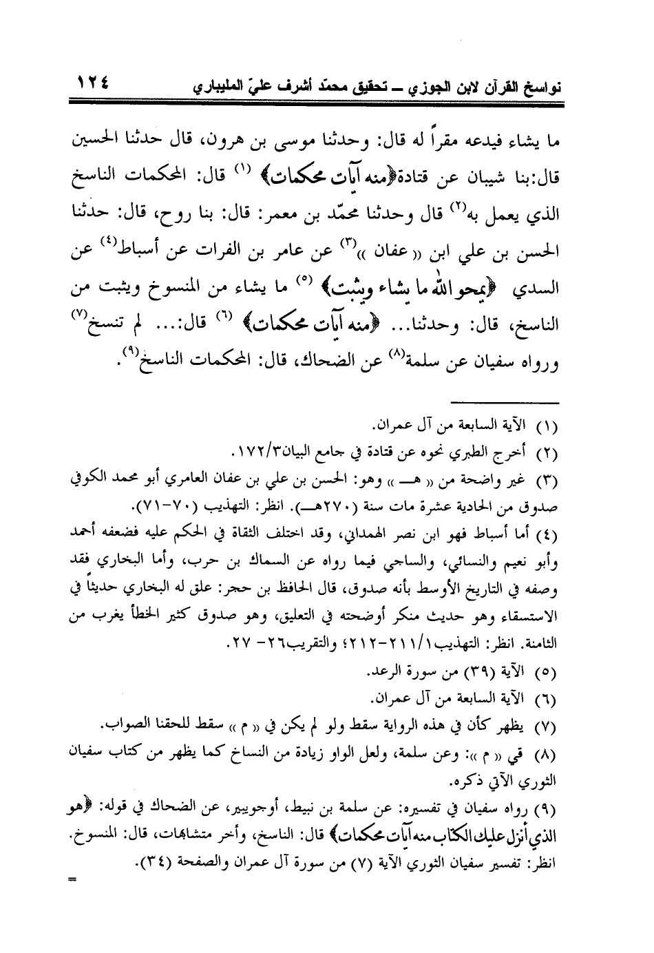 مَا يَشَاءُ فَيَدَعُهُ مُقِرًّا لَهُ قال: وحدثنا موسى بن هرون، قال حدثنا الحسين قال: بنا شَيْبَانُ عَنْ قَتَادَةَ {مِنْهُ آيَاتٌ مُحْكَمَاتٌ} 1 قَالَ: الْمُحْكَمَاتُ النَّاسِخُ الَّذِي يُعْمَلُ بِهِ2 قَالَ وَحَدَّثَنَا مُحَمَّدُ بْنُ معمر: قال: بنا رَوْحٌ، قَالَ: حَدَّثَنَا الْحَسَنُ بْنُ علي ابن عَفَّانَ 3 عَنْ عَامِرِ بْنِ الْفُرَاتِ عن أسباط4 عن السدي {يَمْحُوا اللَّهُ مَا يَشَاءُ وَيُثْبِتُ} 5 مَا يَشَاءُ مِنَ الْمَنْسُوخِ وَيُثْبِتُ مِنَ النَّاسِخِ، قَالَ: وَحَدَّثَنَا ... {مِنْهُ آيَاتٌ مُحْكَمَاتٌ} 6 قَالَ: ... لَمْ تُنْسَخْ7 وَرَوَاهُ سُفْيَانُ عَنْ سَلَمَةَ8 عَنِ الضحاك، قال: المحكمات الناسخ9.