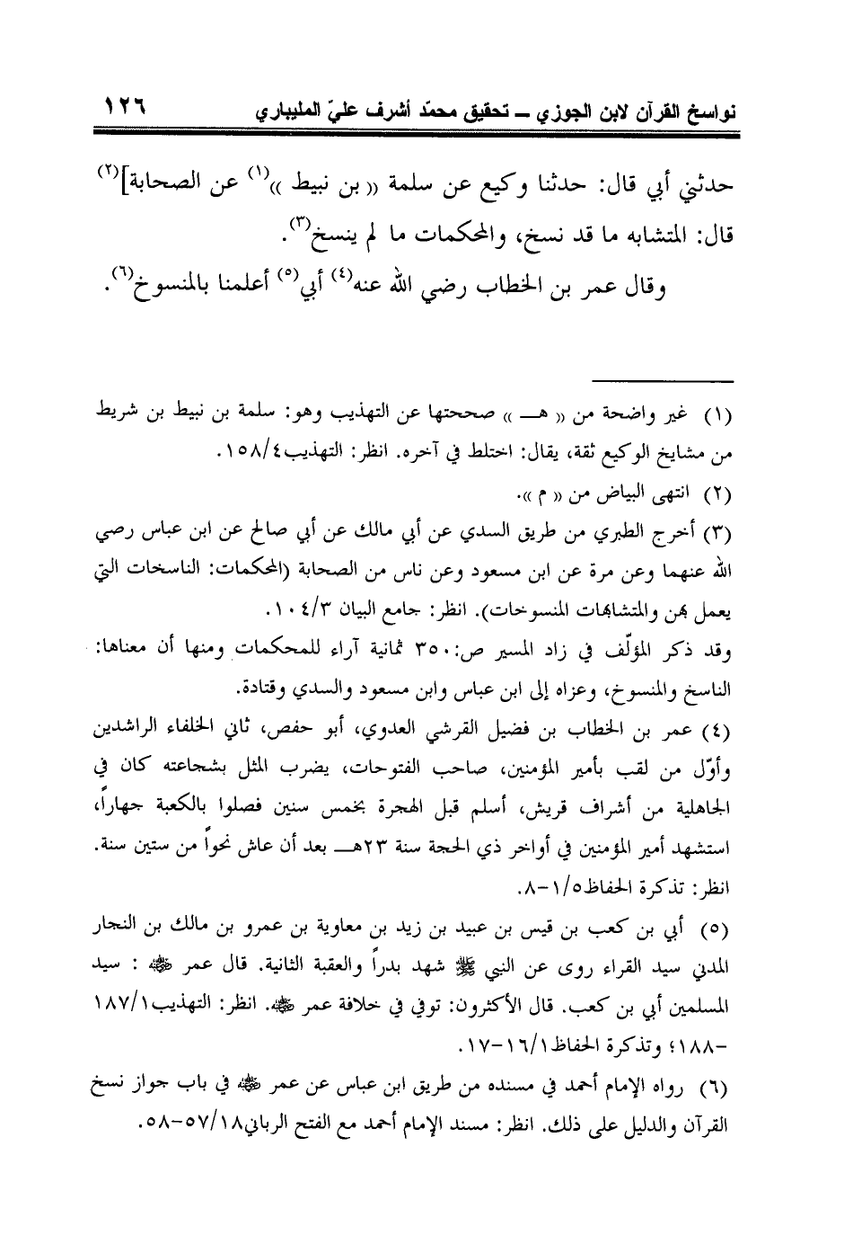 وقال عمر بن الخطاب رضي اللَّهُ عَنْهُ: 4 "أُبَيٌّ5 أَعْلَمُنَا بِالْمَنْسُوخِ"6.