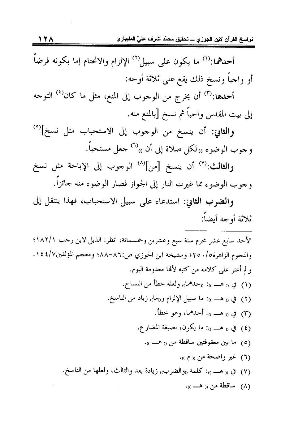 أحدهما: 1 مَا يَكُونُ عَلَى سَبِيلِ2 الْإِلْزَامِ وَالِانْحِتَامِ إِمَّا بِكَوْنِهِ فَرْضًا أَوْ وَاجِبًا وَنَسْخُ ذَلِكَ يَقَعُ عَلَى ثلاثة أوجه: