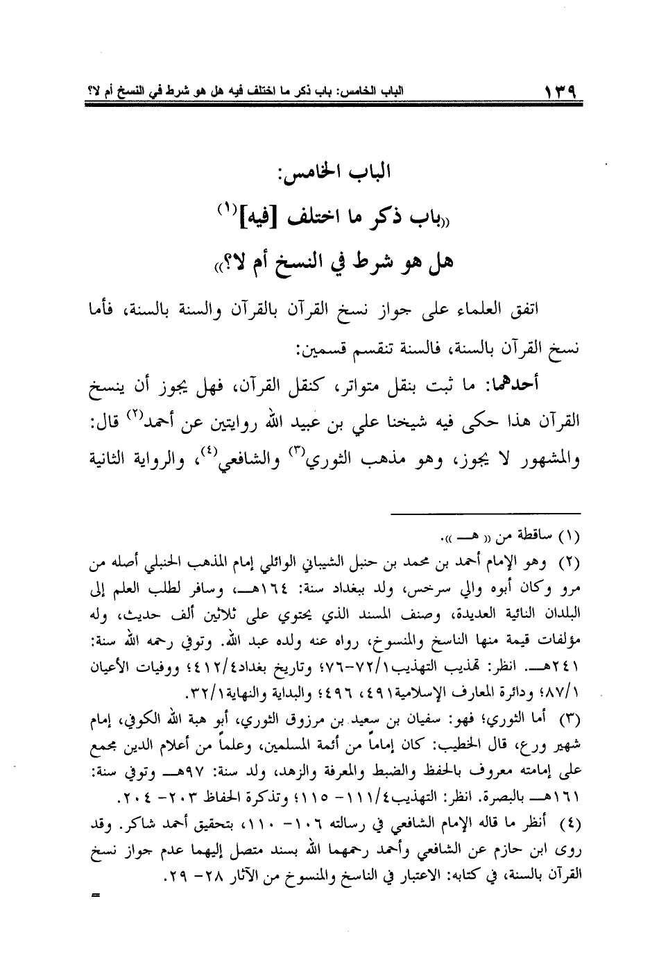 أحدهما: مَا ثَبَتَ بِنَقْلٍ مُتَوَاتِرٍ، كَنَقْلِ الْقُرْآنِ، فَهَلْ يَجُوزُ أَنْ يُنْسَخَ القرآن هَذَا حَكَى فِيهِ شَيْخُنَا عَلِيُّ بْنُ عُبَيْدِ اللَّهِ رِوَايَتَيْنِ عَنْ أحمد2 قال: والمشهور لا يَجُوزُ، وَهُوَ مَذْهَبُ الثَّوْرِيِّ3 والشافعي4، والرواية الثانية