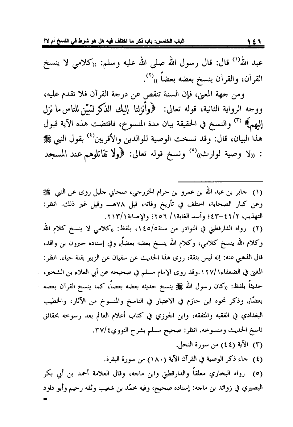 2رواه الدارقطني في النوادر من سنة5/ 145، بلفظ: كلامي لا ينسخ كلام الله وكلام الله ينسخ كلامي، وكلام الله ينسخ بعضه بعضاً وفي إسناده جبرون بن واقد، قال الذهبي عنه: إنه ليس بثقة، روى هذا الحديث عن سفيان عن الزبير بقلة حياء. انظر: المغنى في الضعفاء1/ 127.وقد روى الإمام مسلم في صحيحه عن أبي العلاء بن الشخير، حديثاً بلفظ: كان رسول الله صلى الله عليه وسلم ينسخ حديثه بعضه بعضاً، كما ينسخ القرآن بعضه بعضًا وذكر نحوه ابن حازم في الاعتبار في الناسخ والمنسوخ من الآثار، والخطيب البغدادي في الفقيه والمتفقه، وابن الجوزي في كتاب أعلام العالم بعد رسوخه بحقائق ناسخ الحديث ومنسوخه. انظر: صحيح مسلم بشرح النووي4/ 37.