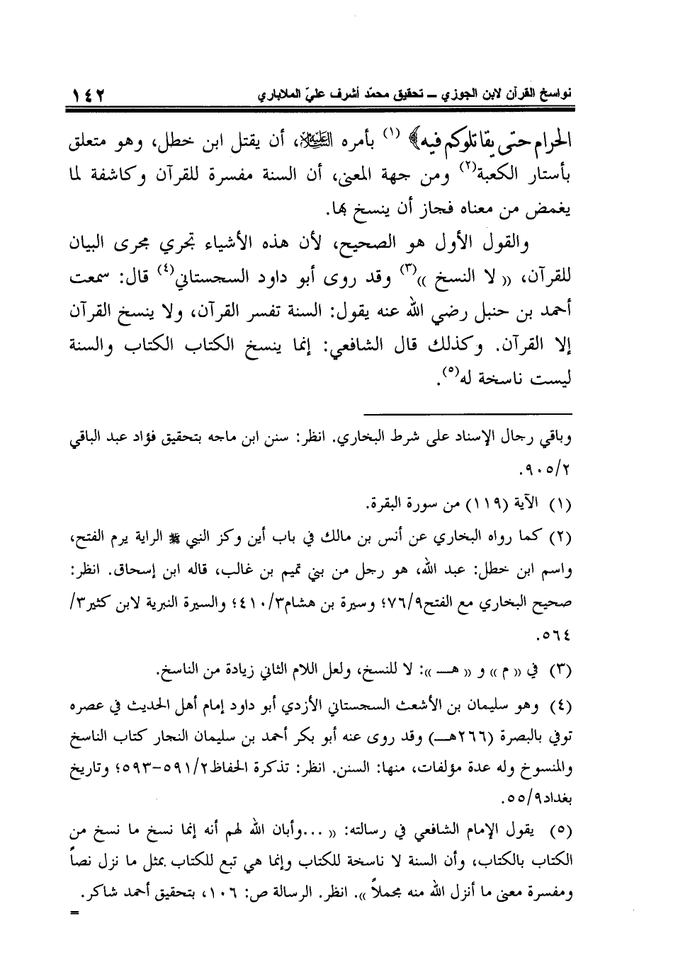 الْحَرَامِ حَتَّى يُقَاتِلُوكُمْ فِيهِ} 1 بأمره عليه السلام، أَنْ يُقْتَلَ ابْنُ خَطَلٍ، وَهُوَ مُتَعَلِّقٌ بِأَسْتَارِ الْكَعْبَةِ2 وَمِنْ جِهَةِ الْمَعْنَى، أَنَّ السُّنَّةَ مُفَسِّرَةٌ لِلْقُرْآنِ وَكَاشِفَةٌ لِمَا يَغْمُضُ مِنْ مَعْنَاهُ فَجَازَ أَنْ يُنْسَخَ بِهَا.