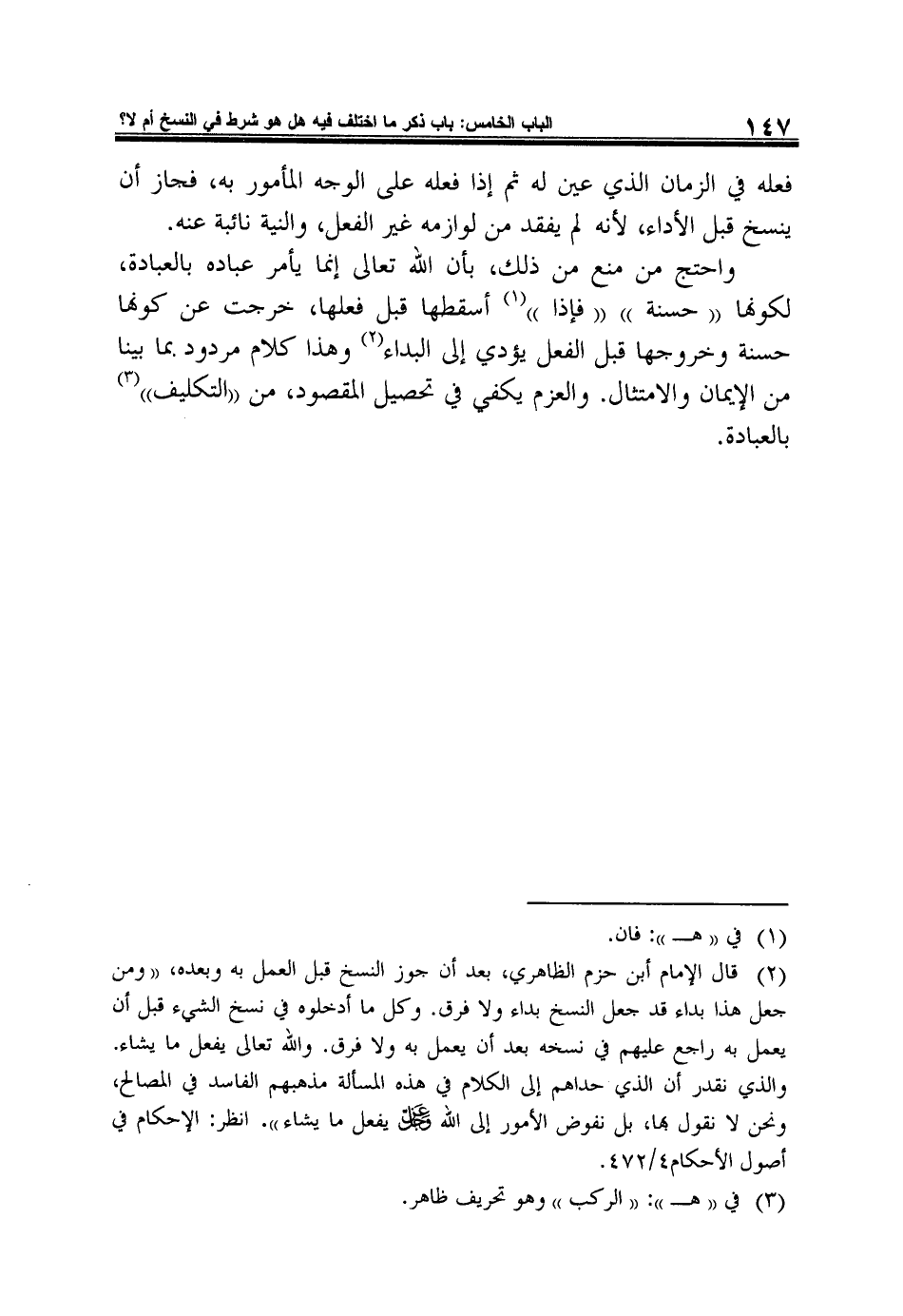 وَاحْتَجَّ مَنْ مَنَعَ مِنْ ذَلِكَ، بِأَنَّ اللَّهَ تَعَالَى إِنَّمَا يَأْمُرُ عِبَادَهُ بِالْعِبَادَةِ، لَكَوْنِهَا (حَسَنَةً) (فَإِذَا) 1 أَسْقَطَهَا قَبْلَ فِعْلِهَا، خَرَجَتْ عَنْ كَوْنِهَا حَسَنَةً وَخُرُوجُهَا قَبْلَ الْفِعْلِ يُؤَدِّي إِلَى الْبَدَاءِ2 وَهَذَا كَلامٌ مَرْدُودٌ بِمَا بَيَّنَّا مِنَ الْإِيمَانِ وَالِامْتِثَالِ. وَالْعَزْمِ يَكْفِي فِي تَحْصِيلِ الْمَقْصُودِ، من (التكليف) 3 بالعبادة.