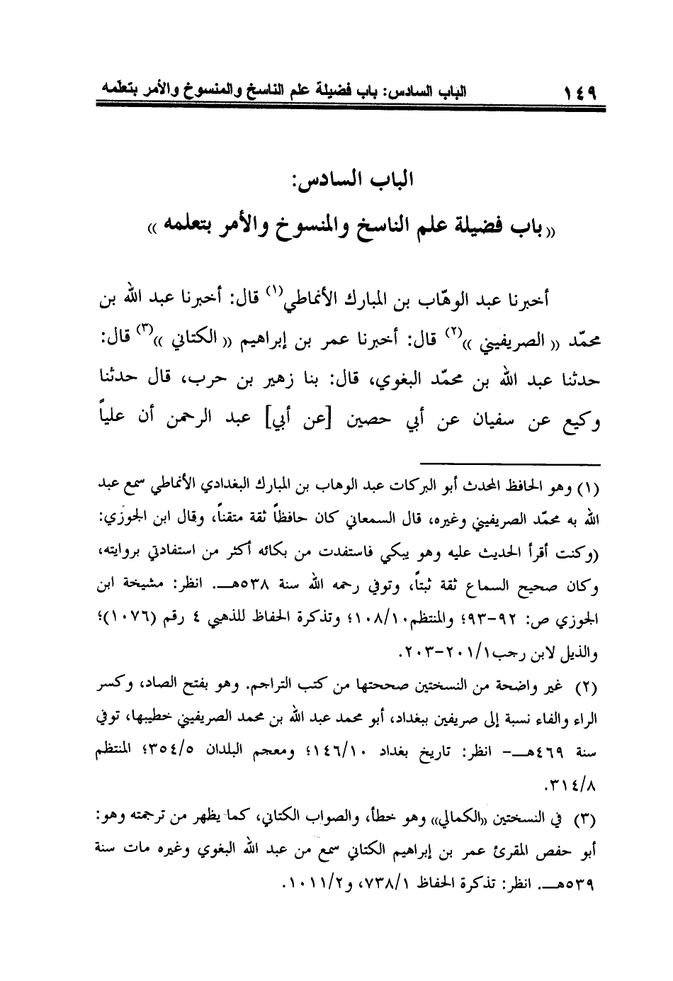 الْبَابُ السَّادِسُ: بَابُ فَضِيلَةِ عِلْمِ النَّاسِخِ وَالْمَنْسُوخِ وَالأَمْرِ بِتَعَلُّمِهِ