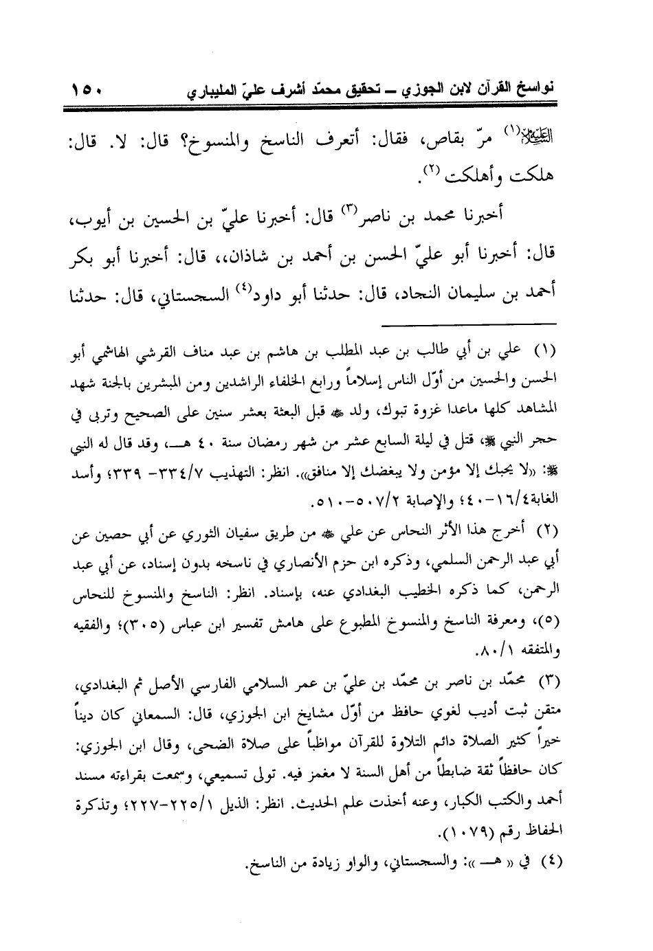 2 أخرج هذا الأثر النحاس عن علي رضي الله عنه من طريق سفيان الثوري عن أبي حصين عن أبي عبد الرحمن السلمي، وذكره ابن حزم الأنصاري في ناسخه بدون إسناد، عن أبي عبد الرحمن، كما ذكره الخطيب البغدادي عنه، بإسناد. انظر: الناسخ والمنسوخ للنحاس (5)، ومعرفة الناسخ والمنسوخ المطبوع على هامش تفسير ابن عباس 305؛ والفقيه والمتفقه 1/ 80.