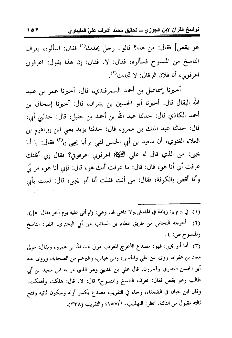 أَخْبَرَنَا إِسْمَاعِيلُ بْنُ أَحْمَدَ السَّمَرْقَنْدِيُّ، قَالَ: أَخْبَرَنَا عُمَرُ بْنُ عُبَيْدِ اللَّهِ الْبَقَّالُ قَالَ: أَخْبَرَنَا أَبُو الْحُسَيْنِ بْنُ بِشْرَانَ، قَالَ: أَخْبَرَنَا إِسْحَاقُ بْنُ أَحْمَدَ الْكَاذِيُّ قَالَ: حَدَّثَنَا عَبْدُ اللَّهِ بْنُ أَحْمَدَ بْنِ حَنْبَلٍ، قَالَ: حَدَّثَنِي أَبِي، قَالَ: حَدَّثَنَا عَبْدُ الْمَلِكِ بْنُ عَمْرٍو، قَالَ: حَدَّثَنَا يَزِيدُ يَعْنِي ابْنَ إِبْرَاهِيمَ بْنِ الْعَلاءِ الْغَنَوِيُّ، أَنَّ سَعِيدَ بْنَ أَبِي الْحَسَنِ لَقِيَ (أَبَا يَحْيَى) 3 فَقَالَ: يَا أَبَا يَحْيَى: مَنِ الَّذِي قَالَ لَهُ عَلِيٌّ عَلَيْهِ السَّلامُ اعْرِفُونِي اعْرِفُونِي؟ فَقَالَ إِنِّي أَظُنُّكَ عَرَفْتَ أَنِّي أنا هو، قال: قَالَ: مَا عَرَفْتُ أَنَّكَ هُوَ، قَالَ: فَإِنِّي أَنَا هُوَ، مَرَّ بِي وَأَنَا أَقُصُّ بِالْكُوفَةِ، فَقَالَ: مَنْ أَنْتَ فَقُلْتُ أَنَا أَبُو يحيى، قال: لست بأبي