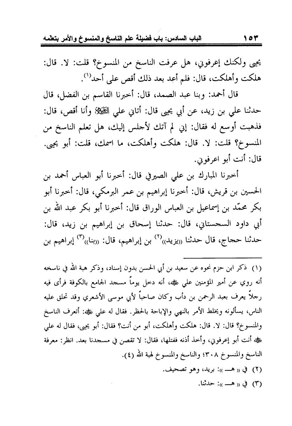 يَحْيَى وَلَكِنَّكَ اعْرِفُونِي، هَلْ عَرَفْتَ النَّاسِخَ مِنَ الْمَنْسُوخِ؟ قُلْتُ: لا. قَالَ: هَلَكْتَ وَأَهْلَكْتَ، قَالَ: فَلَمْ أَعُدْ بَعْدَ ذَلِكَ أَقُصُّ عَلَى أحد1.