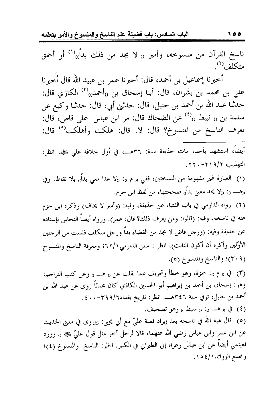 5 قال هبة الله في ناسخه بعد إيراد قصة عليّ مع أبي يحيى: يروى في معنى الحديث عن ابن عمر وابن عباس رضي الله عنهما، قالا لرجل آخر مثل قول عليّ رضي الله عنه وورد الهيثمي أيضاً عن ابن عباس وعزاه إلى الطبراني في الكبير. انظر: الناسخ والمنسوخ 4؛ ومجمع الزوائد1/ 154.