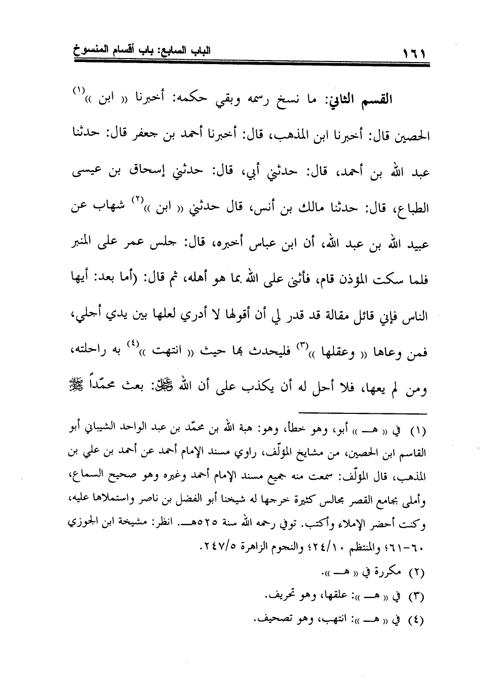 الْقِسْمُ الثَّانِي: مَا نُسِخَ رَسْمُهُ وَبَقِيَ حُكْمُهُ: أَخْبَرَنَا (ابْنُ) 1 الْحُصَيْنِ قَالَ: أَخْبَرَنَا ابْنُ الْمُذْهِبِ، قَالَ: أَخْبَرَنَا أَحْمَدُ بْنُ جَعْفَرٍ قَالَ: حَدَّثَنَا عَبْدُ اللَّهِ بْنُ أَحْمَدَ، قَالَ: حَدَّثَنِي أَبِي، قَالَ: حَدَّثَنِي إِسْحَاقُ بْنُ عِيسَى الطَّبَّاعُ، قَالَ: حَدَّثَنَا مَالِكُ بْنُ أَنَسٍ، قَالَ حَدَّثَنِي (ابْنُ) 2 شِهَابٍ عَنْ عُبَيْدِ اللَّهِ بْنِ عَبْدِ اللَّهِ، أَنَّ ابْنَ عَبَّاسٍ أَخْبَرَهُ، قَالَ: جَلَسَ عُمَرُ عَلَى الْمِنْبَرِ فَلَمَّا سَكَتَ الْمُؤَذِّنُ قَامَ، فَأَثْنَى عَلَى اللَّهِ بِمَا هُوَ أَهْلُهُ، ثُمَّ قَالَ: "أَمَّا بَعْدُ: أَيُّهَا النَّاسُ فَإِنِّي قَائِلٌ مَقَالَةً قَدْ قُدِّرَ لِي أَنْ أَقُولَهَا لا أَدْرِي لَعَلَّهَا بَيْنَ يَدَيْ أَجَلِي، فَمَنْ وَعَاهَا (وَعَقِلَهَا) 3 فَلْيُحَدِّثْ بِهَا حَيْثُ (انْتَهَتْ) 4 بِهِ رَاحِلَتُهُ، وَمَنْ لَمْ يَعِهَا، فَلا أُحِلُّ لَهُ أَنْ يَكْذِبَ على أن الله عزوجل: بَعَثَ مُحَمَّدًا صَلَّى اللَّهُ عَلَيْهِ وسلم