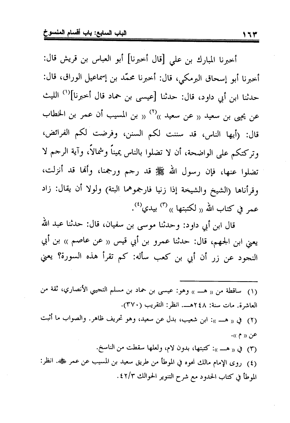 أَخْبَرَنَا الْمُبَارَكُ بْنُ عَلِيٍّ [قَالَ أَخْبَرَنَا] أَبُو الْعَبَّاسِ بْنُ قُرَيْشٍ قَالَ: أَخْبَرَنَا أَبُو إِسْحَاقَ الْبَرْمَكِيُّ، قَالَ: أَخْبَرَنَا مُحَمَّدُ بْنُ إِسْمَاعِيلَ الْوَرَّاقُ، قَالَ: حَدَّثَنَا ابْنُ أَبِي دَاوُدَ، قَالَ: حَدَّثَنَا [عِيسَى بْنُ حَمَّادٍ قَالَ أَخْبَرَنَا] 1 اللَّيْثُ عَنْ يَحْيَى بْنِ سَعِيدٍ (عَنْ سَعِيدِ) 2 (بْنِ الْمُسَيِّبِ أَنَّ عُمَرَ بْنَ الْخَطَّابِ قَالَ: "أَيُّهَا النَّاسُ، قَدْ سَنَنْتُ لَكُمُ السُّنَنَ، وَفَرَضْتُ لَكُمُ الْفَرَائِضَ، وَتَرَكْتُكُمْ عَلَى الْوَاضِحَةِ، أَنْ لا تَضِلُّوا بِالنَّاسِ يَمِينًا وَشِمَالا، وَآيَةُ الرَّجْمِ لا تَضِلُّوا عَنْهَا، فَإِنَّ رَسُولُ اللَّهِ صَلَّى اللَّهُ عَلَيْهِ وَسَلَّمَ قَدْ رَجَمَ وَرَجَمْنَا، وَأَنَّهَا قَدْ أُنْزِلَتْ، وَقَرَأْنَاهَا (الشَّيْخُ وَالشَّيْخَةُ إِذَا زَنَيَا فَارْجُمُوهُمَا الْبَتَّةَ" وَلَوْلا أَنْ يُقَالَ: زَادَ عُمَرُ فِي كِتَابِ اللَّهِ (لَكَتَبْتُهَا) 3 بِيَدِي4.