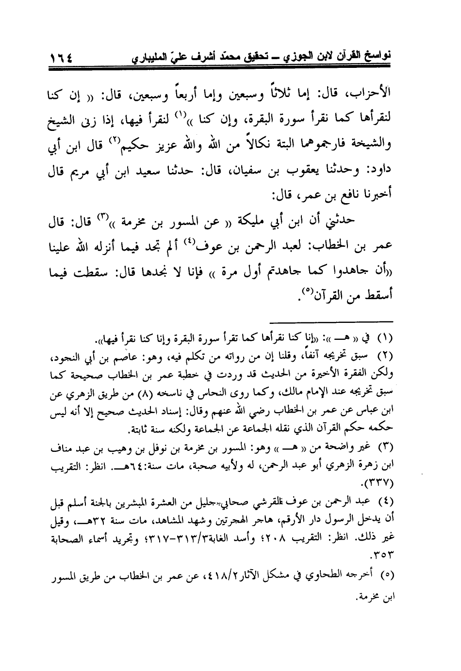 الأَحْزَابَ، قَالَ: إِمَّا ثَلاثًا وَسَبْعِينَ وَإِمَّا أَرْبَعًا وَسَبْعِينَ، قَالَ: (إِنْ كنا لنقرأها كَمَا نَقْرَأُ سُورَةَ الْبَقَرَةِ، وَإِنْ كُنَّا) 1 لَنَقْرَأُ فِيهَا، إِذَا زَنَى الشَّيْخُ وَالشَّيْخَةُ فَارْجُمُوهُمَا الْبَتَّةَ نَكَالا مِنَ اللَّهِ وَاللَّهُ عَزِيزٌ حَكِيمٌ2 قَالَ ابْنُ أَبِي دَاوُدَ: وَحَدَّثَنَا يَعْقُوبُ بْنُ سُفْيَانَ، قَالَ: حَدَّثَنَا سعيد ابن أَبِي مَرْيَمَ قَالَ أَخْبَرَنَا نَافِعُ بْنُ عُمَرَ، قَالَ: حَدَّثَنِي أَنَّ ابْنَ أَبِي مُلَيْكَةَ (عَنِ الْمِسْوَرِ بن مخرمة) 3 قال: قَالَ عُمَرُ بْنُ الْخَطَّابِ: لَعَبْدِ الرَّحْمَنِ بْنِ عَوْفٍ4 أَلَمْ تَجِدْ فِيمَا أَنْزَلَهُ اللَّهُ عَلَيْنَا (أَنْ جَاهِدُوا كَمَا جَاهَدْتُمُ أَوَّلَ مَرَّةٍ) فَإِنَّا لا نَجِدُهَا قَالَ: سَقَطَتْ فيما أسقط من القرآن5.